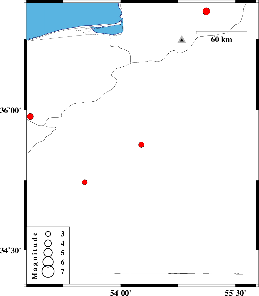 | 2014/06/10 | 21:28:09.1 | 01:58:09.1 | 35.93 | 52.82 | 14 | ML3.6 | Mazandaran Province, 21 km North of Firuzkuh |