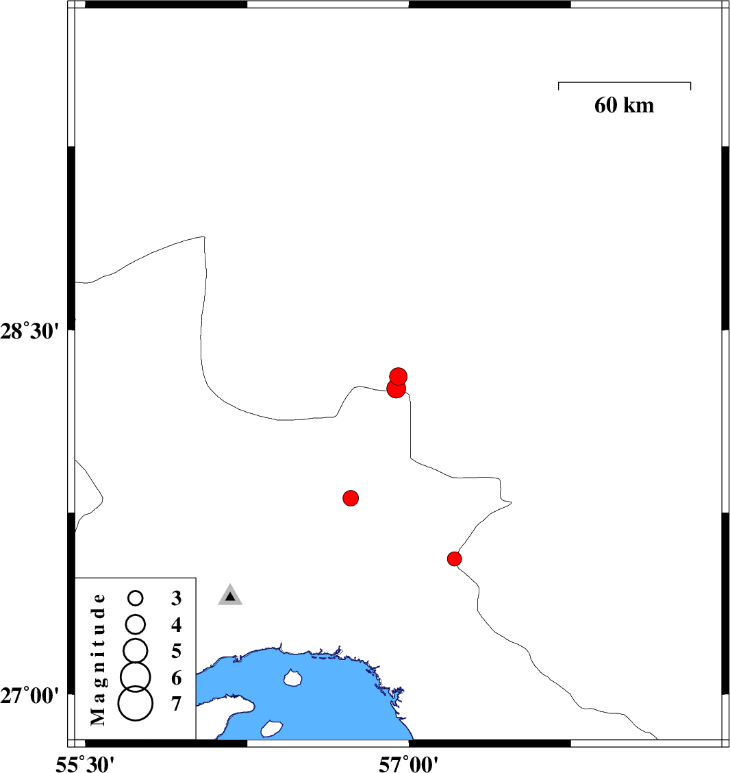| 2014/06/11 | 06:06:33.0 | 10:36:33.0 | 28.26 | 56.94 | 14 | ML3.9 | Kerman Province, 81 km North-West of Kahnuj |