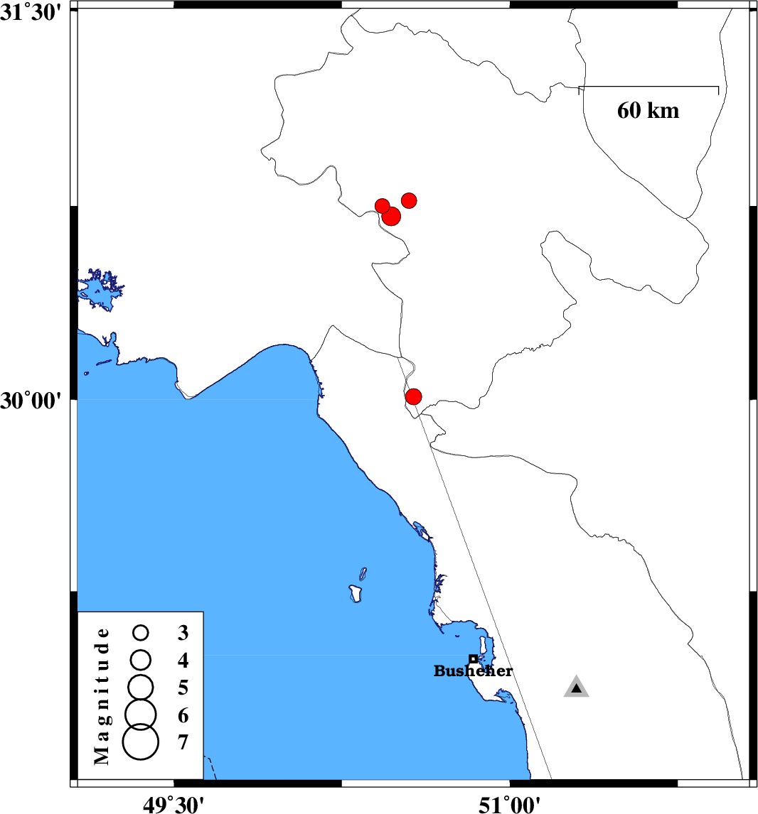 | 2014/06/17 | 06:38:41.5 | 11:08:41.5 | 30.01 | 50.57 | 42 | ML3.3 | Kohkiluieh va boyerahmad Province, 48 km North of Bandar-e genaveh | ||