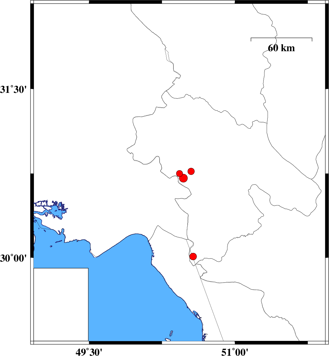 | 2014/06/17 | 06:38:41.5 | 11:08:41.5 | 30.01 | 50.57 | 42 | ML3.3 | Kohkiluieh va boyerahmad Province, 48 km North of Bandar-e genaveh | ||