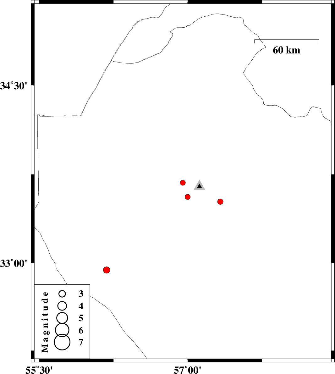 | 2014/06/09 | 23:00:31.4 | 03:30:31.4 | 32.94 | 56.18 | 37 | ML3 | Yazd Province, 101 km South-West of Tabas |