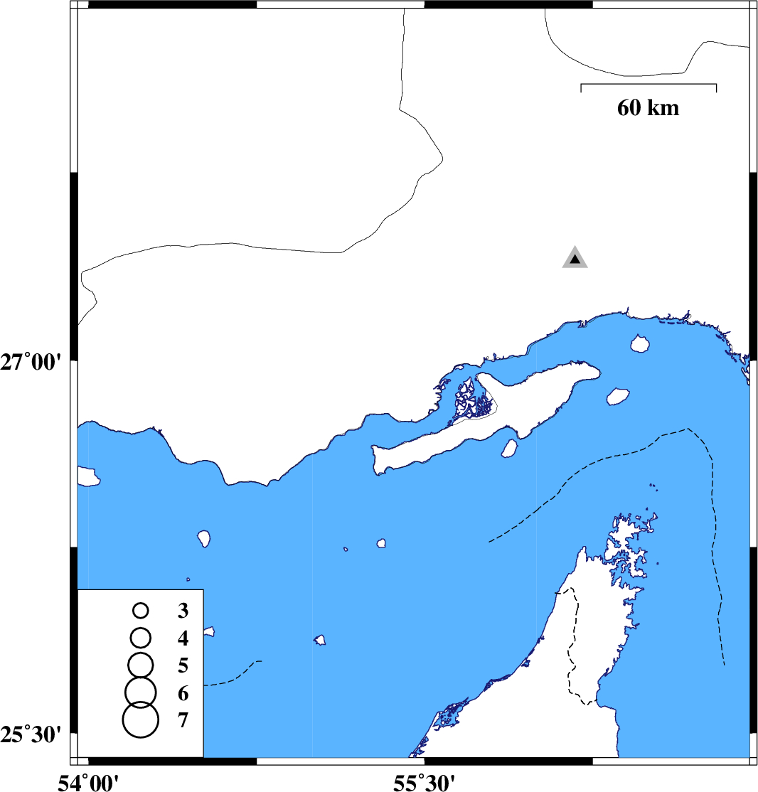 | 2014/07/03 | 04:20:01.1 | 08:50:01.1 | 26.9 | 55.45 | 9 | ML3.9 | Hormozgan Province, 81 km West of Qeshm |