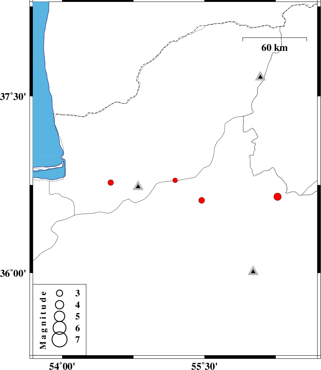 | 2014/06/30 | 16:35:38.1 | 21:05:38.1 | 36.77 | 54.51 | 18 | ML2.7 | Golestan Province, 10 km Gorgan |