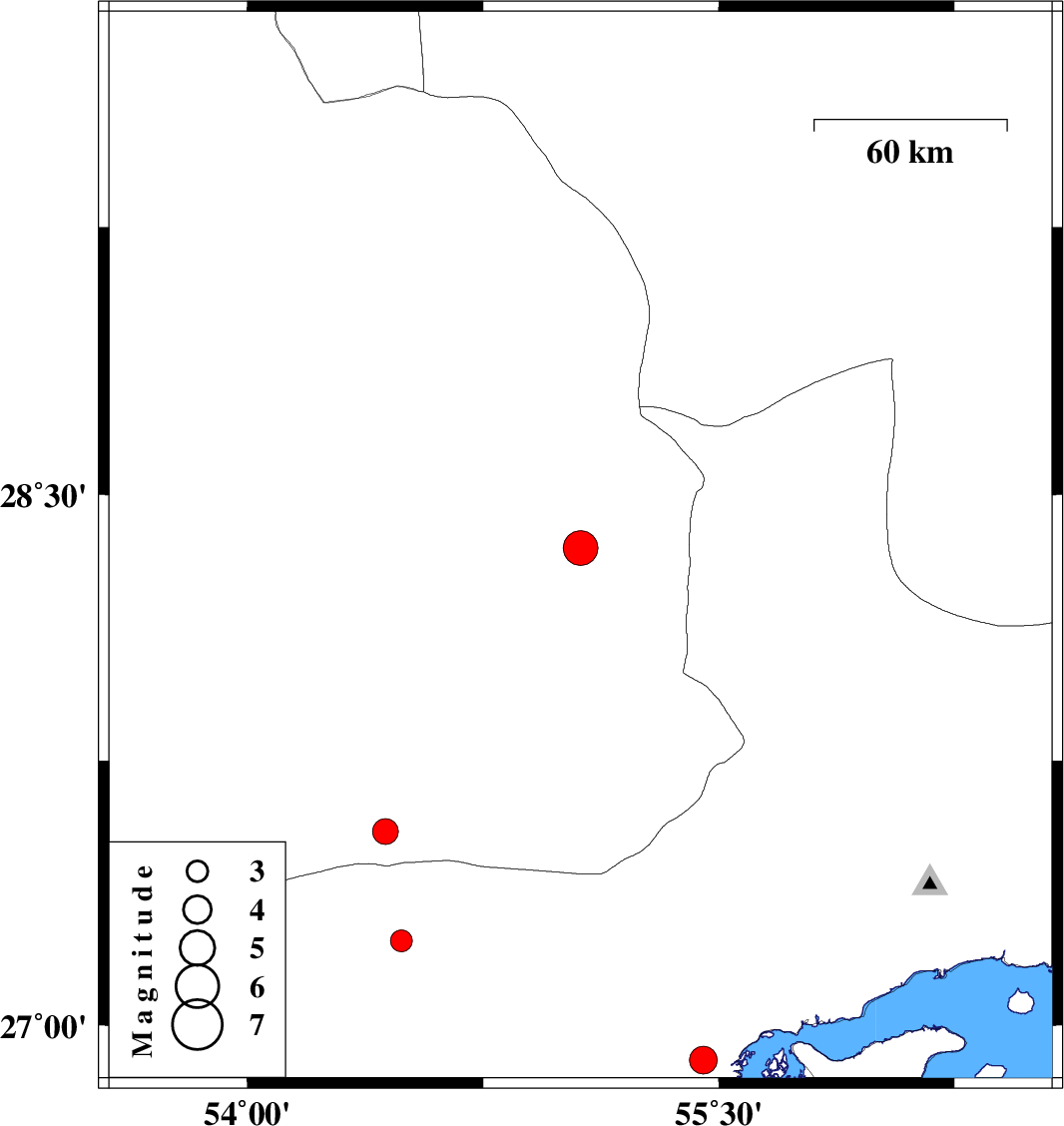 | 2014/06/08 | 06:09:55.8 | 10:39:55.8 | 27.55 | 54.44 | 14 | ML3.7 | Fars Province, 18 km South-East of Lar |