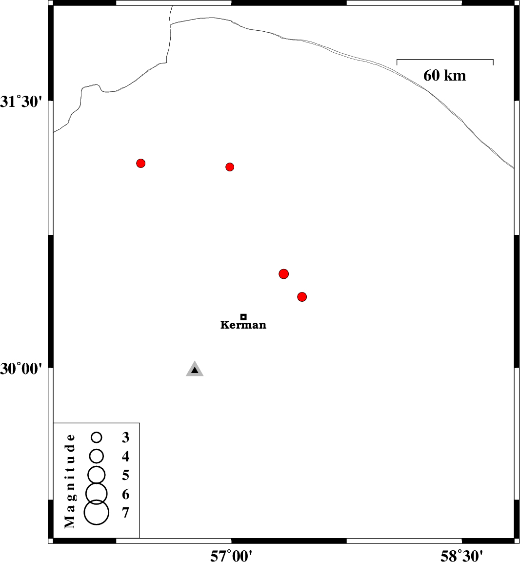 | 2014/07/07 | 18:39:54.9 | 23:09:54.9 | 30.4 | 57.46 | 14 | ML2.7 | Kerman Province, 38 km North-East of Kerman | ||