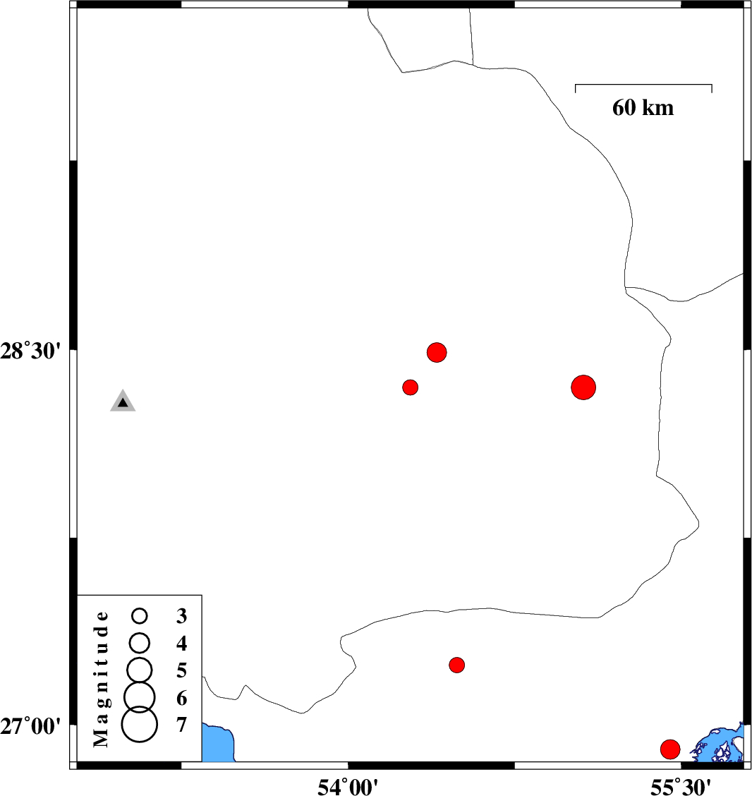 | 2014/07/05 | 03:11:48.3 | 07:41:48.3 | 28.35 | 55.06 | 14 | ML4.9 | Fars Province, 83 km West of Hajiabad | ||