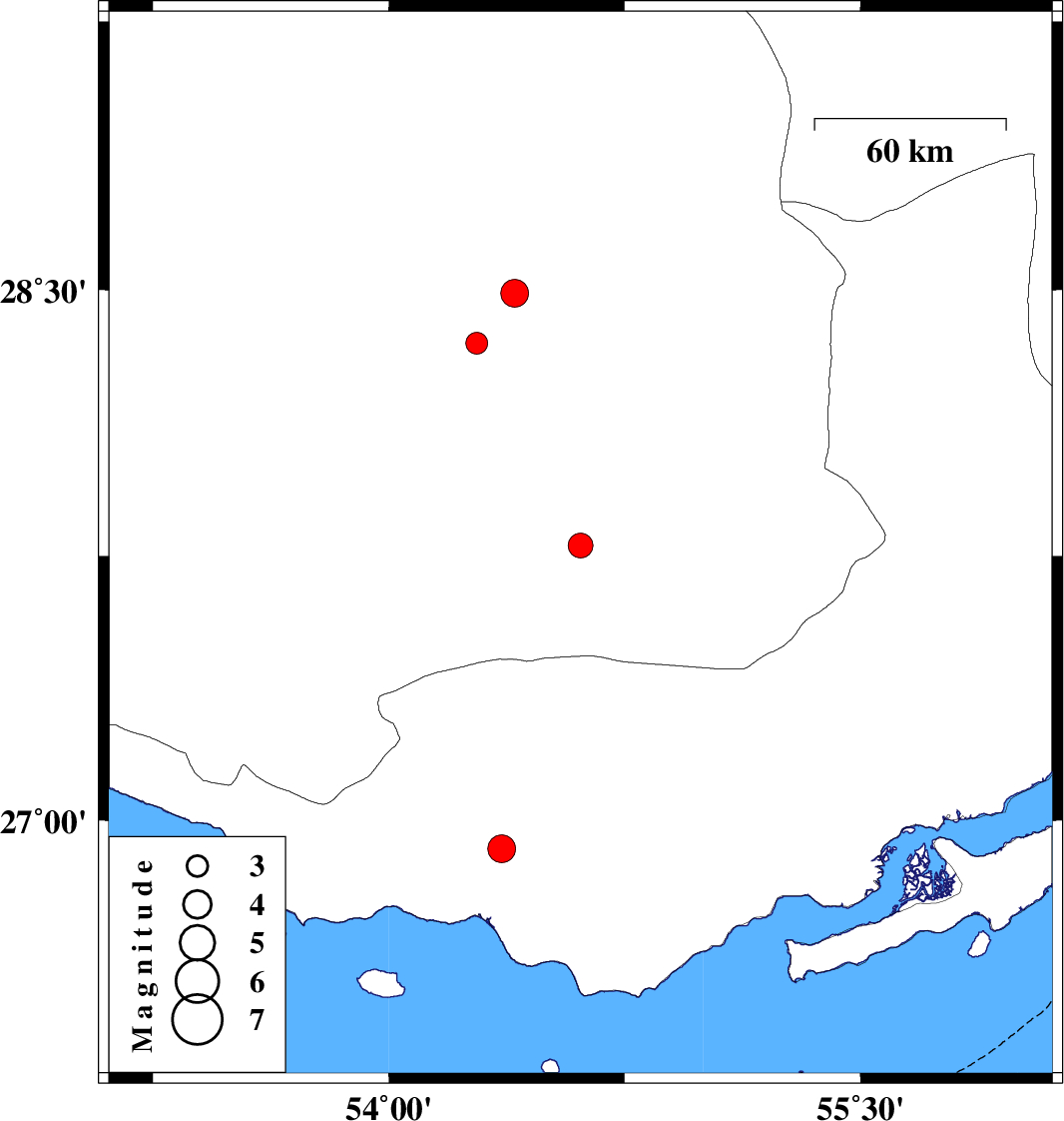 | 2014/07/23 | 04:01:57.4 | 08:31:57.4 | 27.78 | 54.61 | 14 | ML3.5 | Fars Province, 29 km North-East of Lar | ||