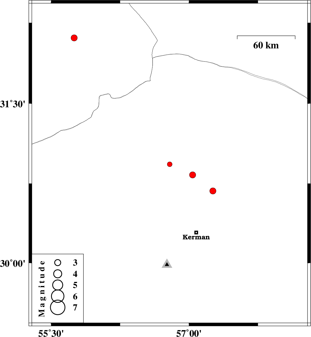 | 2014/07/27 | 00:04:14.9 | 04:34:14.9 | 30.83 | 57.04 | 14 | ML3.1 | Kerman Province, 45 km East of Zarand |
