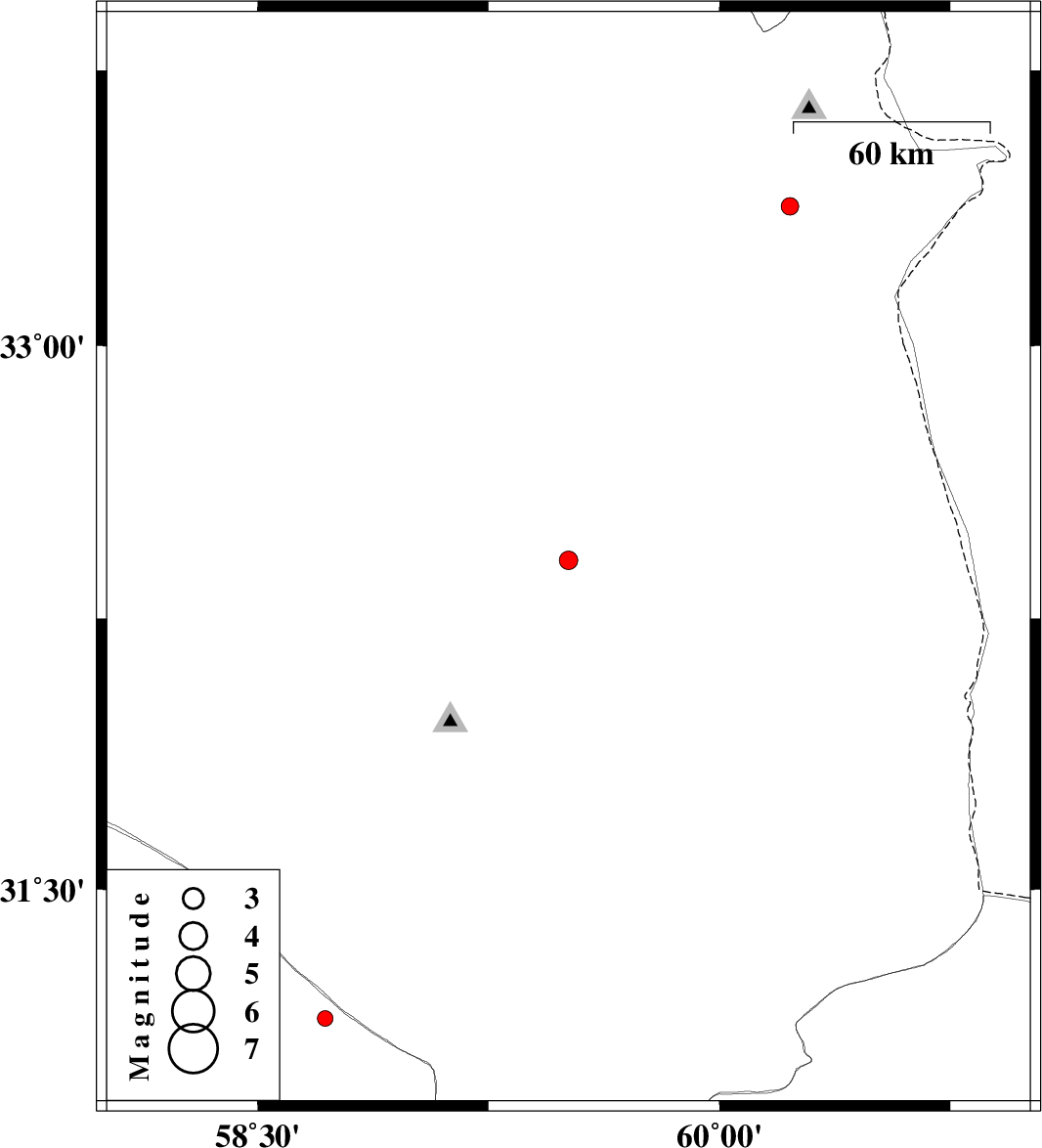 | 2014/07/26 | 21:34:16.3 | 02:04:16.3 | 31.14 | 58.72 | 15 | ML2.2 | Kerman Province, 133 km South-West of Nehbandan |
