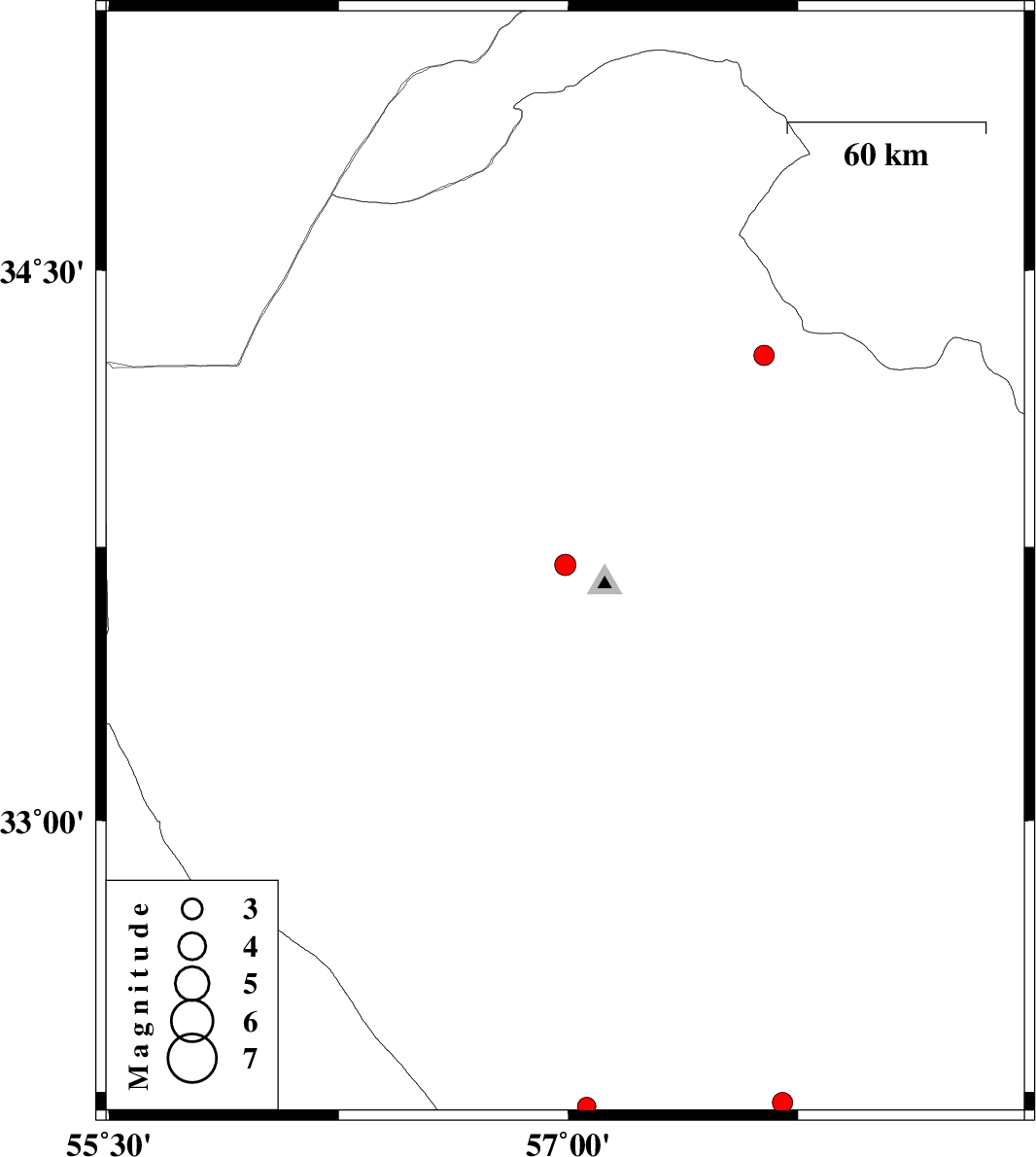 | 2014/08/05 | 22:10:04.8 | 02:40:04.8 | 34.27 | 57.64 | 30 | ML2.9 | Khorasan(center) Province, 58 km North-West of Ferdows |