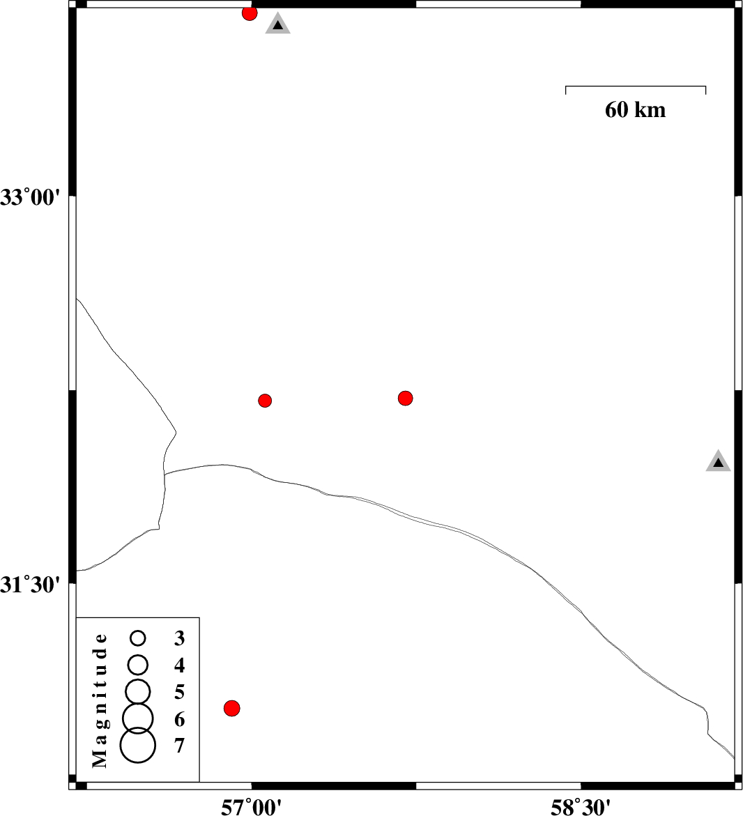 | 2014/08/17 | 00:07:44.7 | 04:37:44.7 | 31.01 | 56.91 | 18 | ML3.2 | Kerman Province, 30 km South-East of Ravar | ||