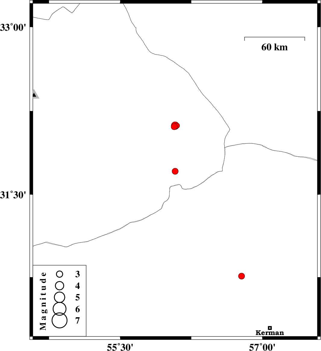 | 2014/08/23 | 09:21:30.8 | 13:51:30.8 | 30.76 | 56.78 | 14 | ML2.9 | Kerman Province, 21 km East of Zarand |