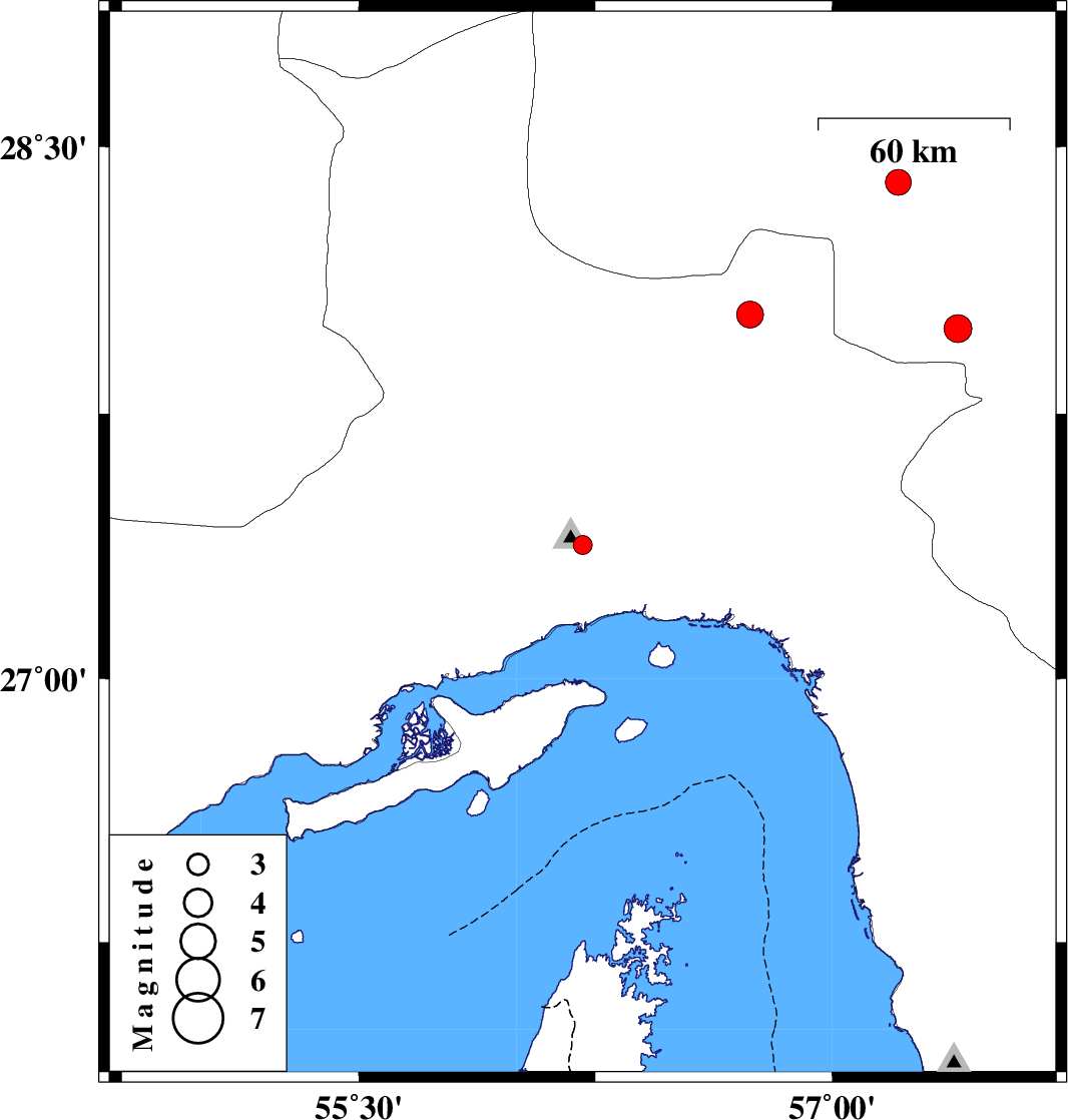| 2014/08/06 | 15:55:32.8 | 20:25:32.8 | 28.4 | 57.21 | 29 | ML3.6 | Kerman Province, 59 km South-West of Jiroft |