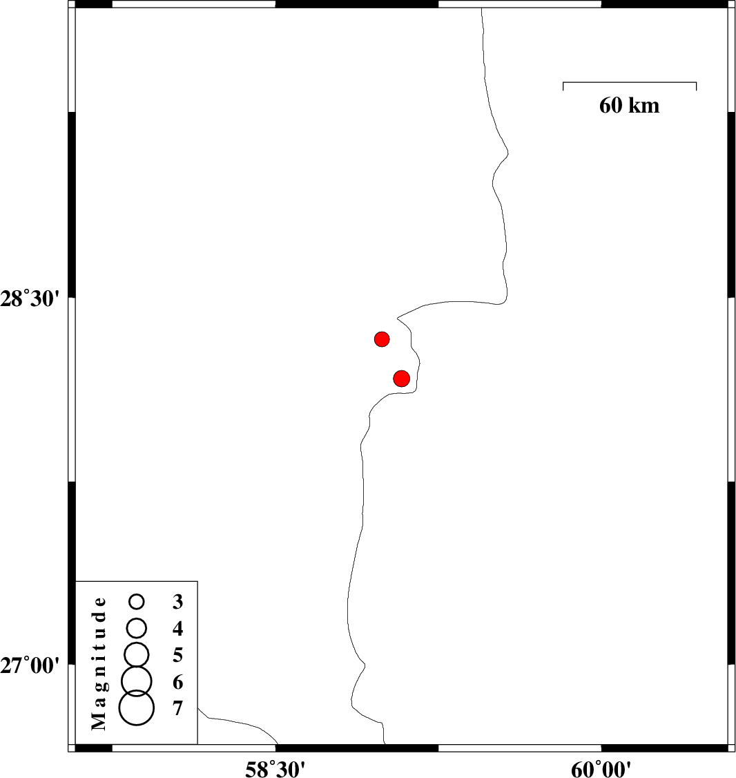 | 2014/08/22 | 01:11:18.9 | 05:41:18.9 | 28.33 | 58.99 | 14 | ML3.1 | Kerman Province, 107 km South-East of Bam |