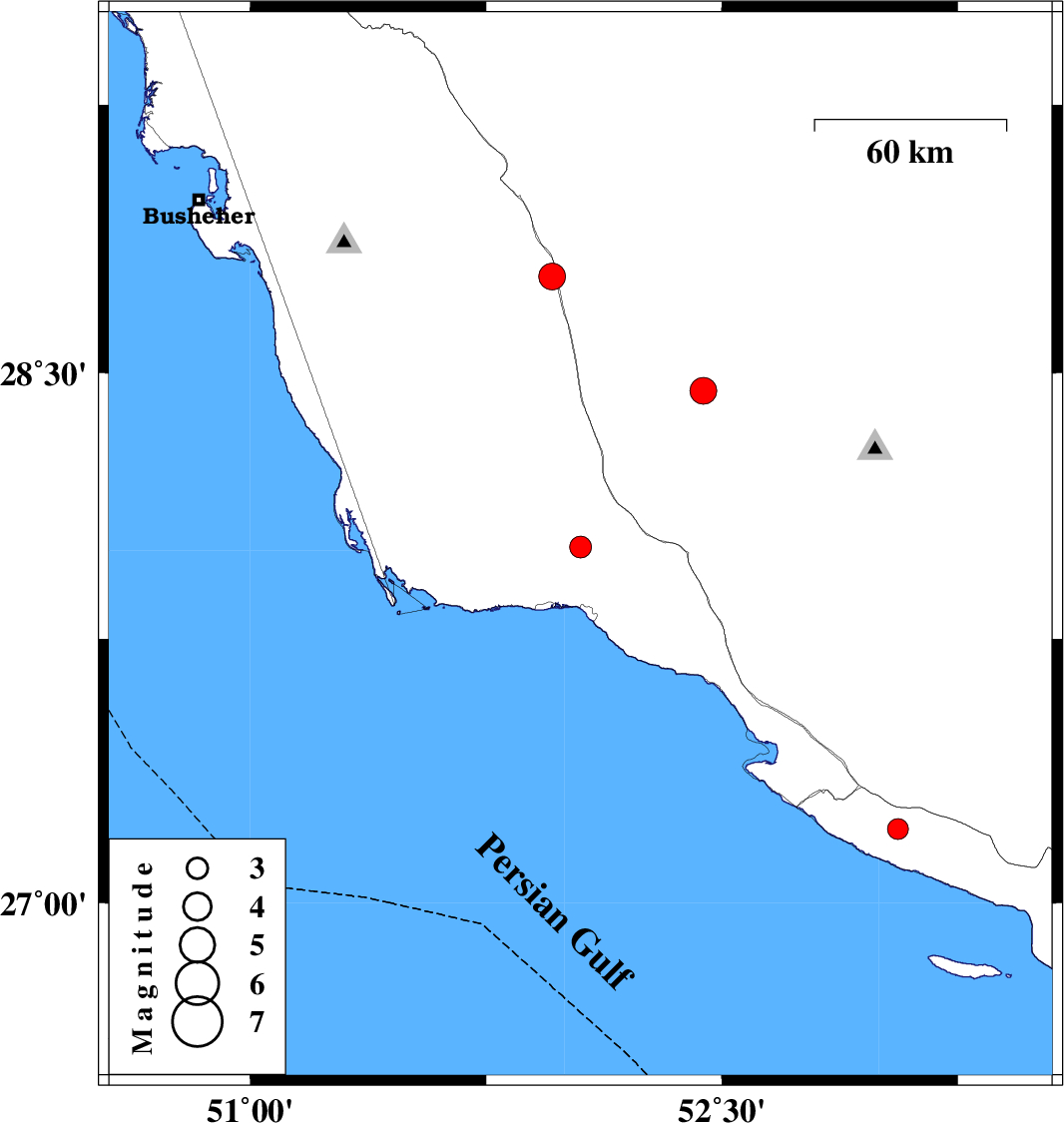 | 2014/09/05 | 17:45:40.3 | 22:15:40.3 | 28.77 | 51.96 | 15 | ML3.8 | Bushehr Province, 17 km West of Farashband |