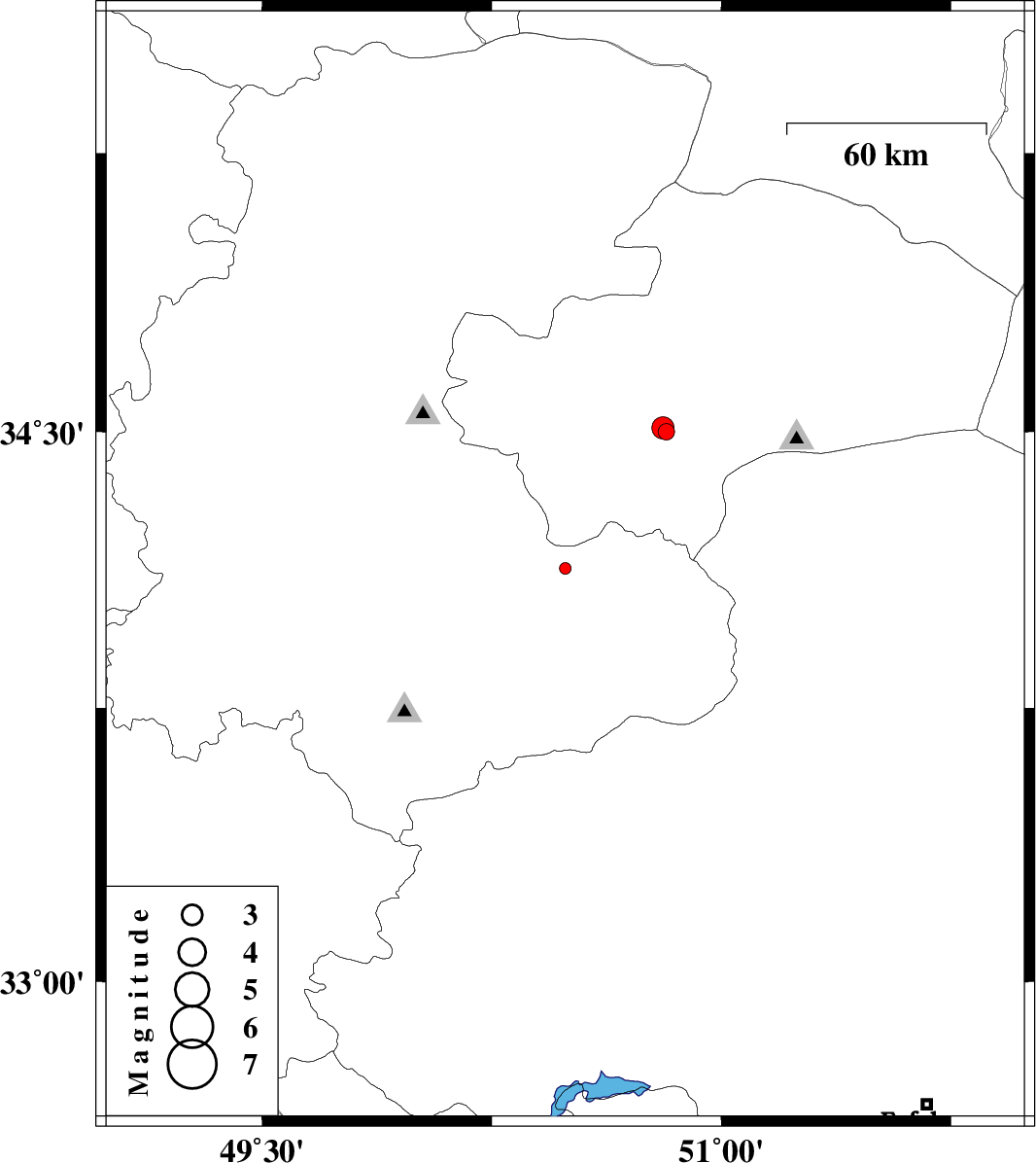 | 2014/10/30 | 10:30:09.3 | 14:00:09.3 | 34.13 | 50.49 | 44 | ML1.7 | Markazi Province, 24 km North of Mahallat | ||