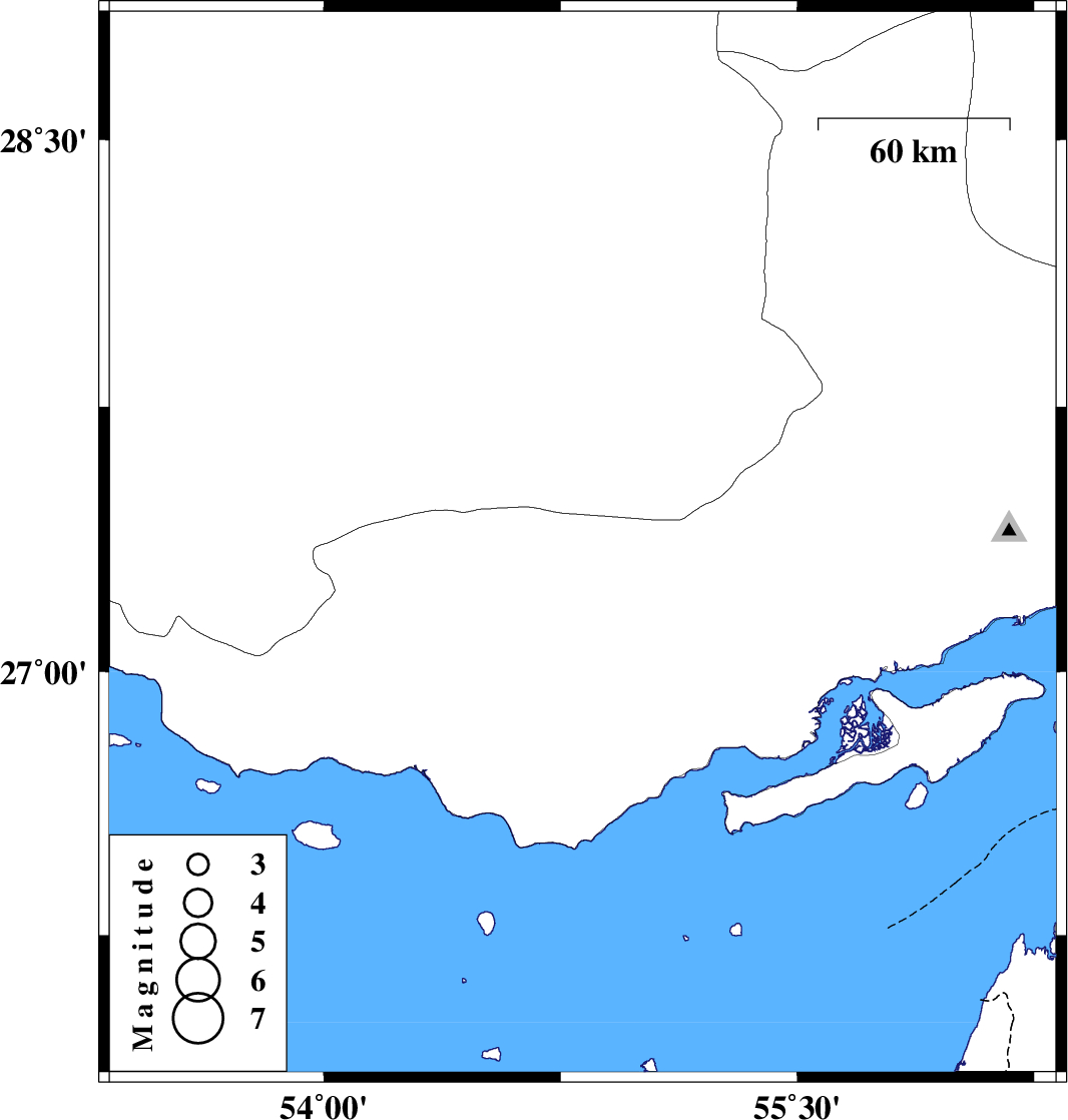 | 2014/11/02 | 11:55:17.8 | 15:25:17.8 | 27.36 | 54.82 | 14 | ML4 | Hormozgan Province, 48 km North-East of Bastak |