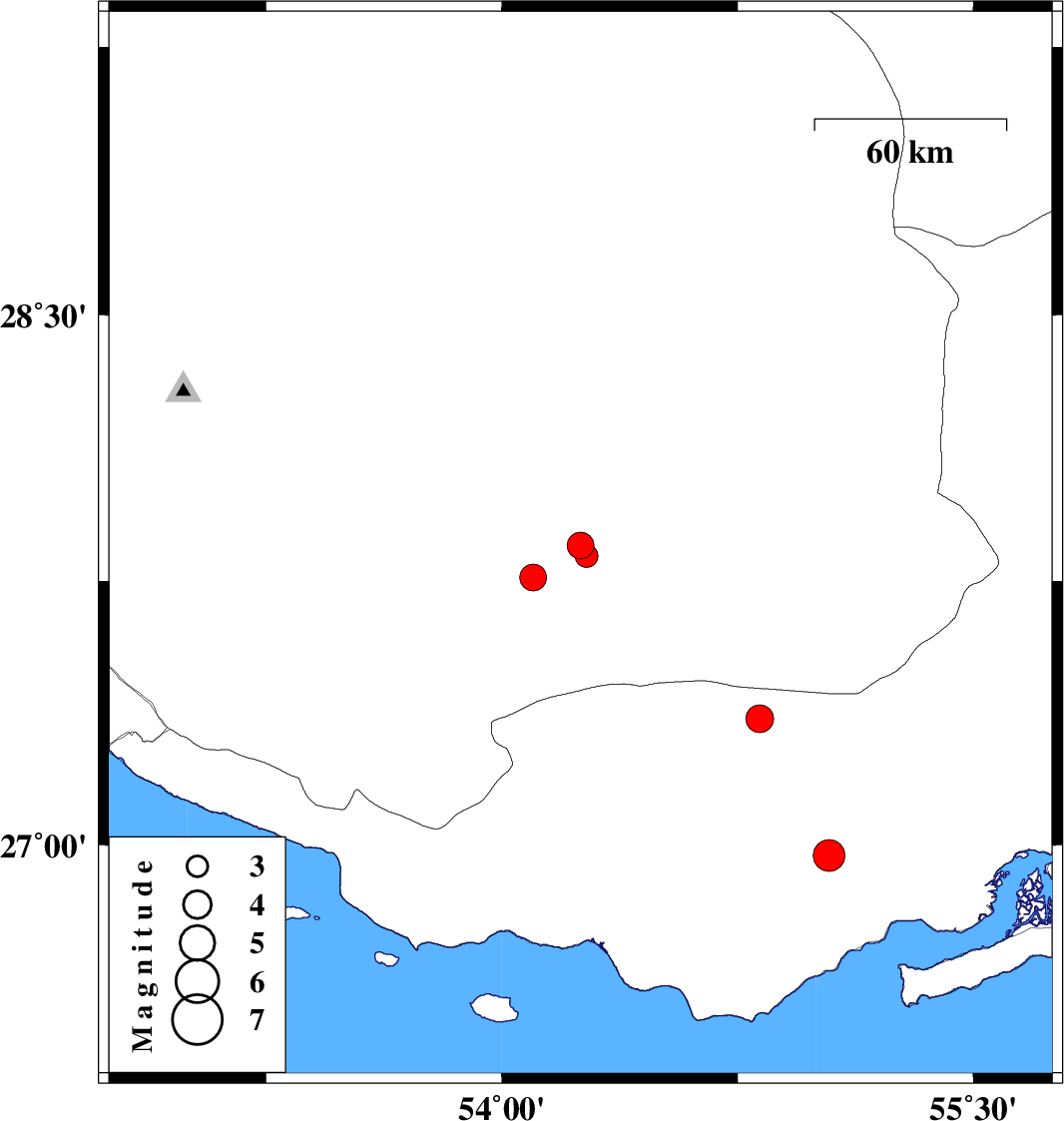| 2014/11/06 | 18:43:30.2 | 22:13:30.2 | 26.97 | 55.04 | 16 | ML4.5 | Hormozgan Province, 53 km North-East of Bandar-e lengeh | ||