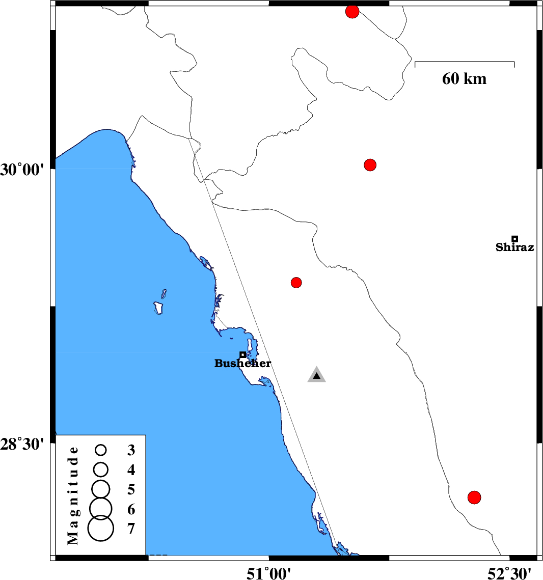 | 2014/11/10 | 22:47:02.1 | 02:17:02.1 | 29.38 | 51.17 | 14 | ML3 | Bushehr Province, 14 km North of Borazjan | ||