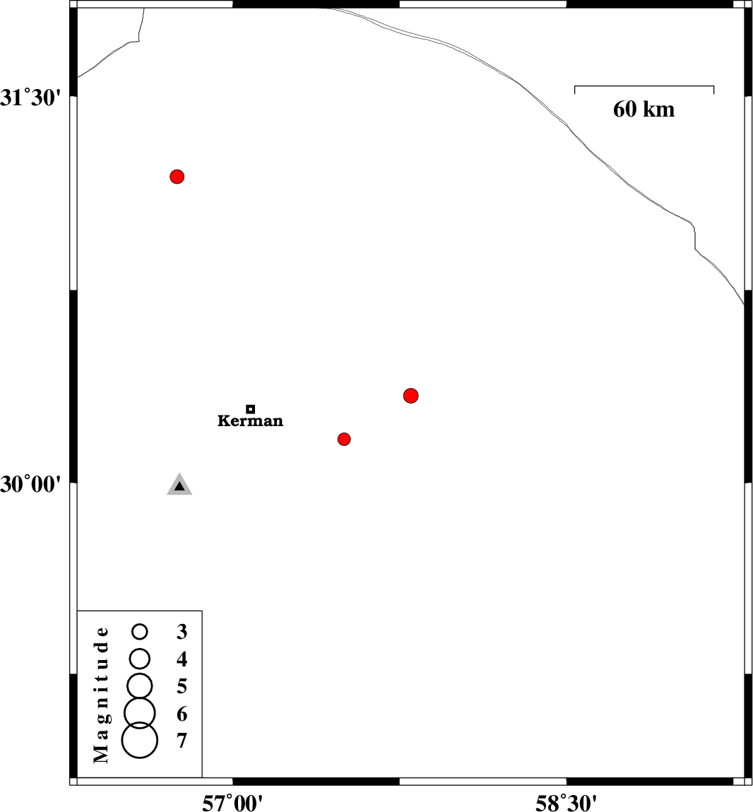 | 2014/11/08 | 22:01:40.3 | 01:31:40.3 | 30.17 | 57.5 | 14 | ML2.6 | Kerman Province, 42 km South-East of Kerman | ||