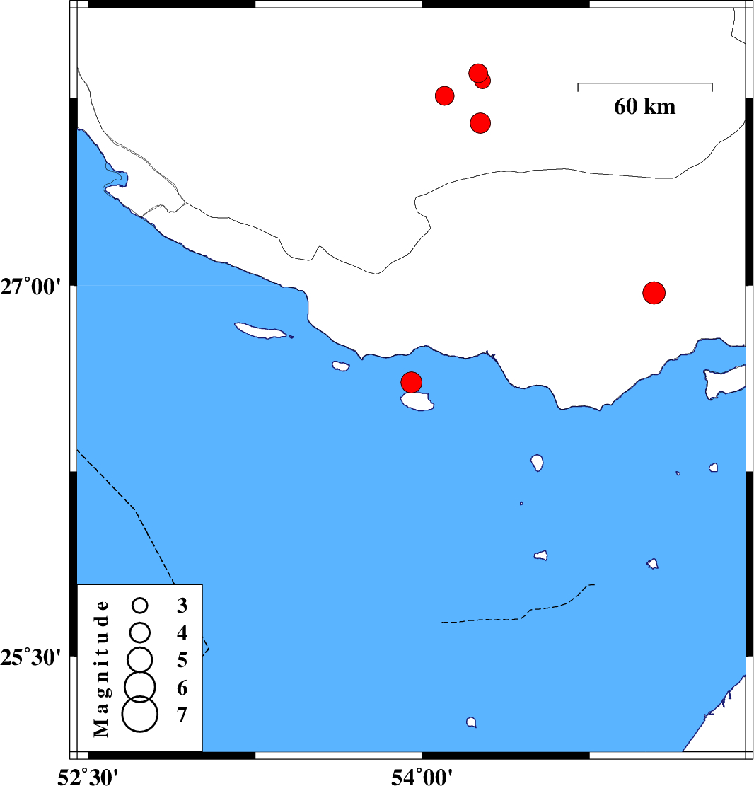 | 2014/11/06 | 18:43:30.2 | 22:13:30.2 | 26.97 | 55.04 | 16 | ML4.5 | Hormozgan Province, 53 km North-East of Bandar-e lengeh | ||