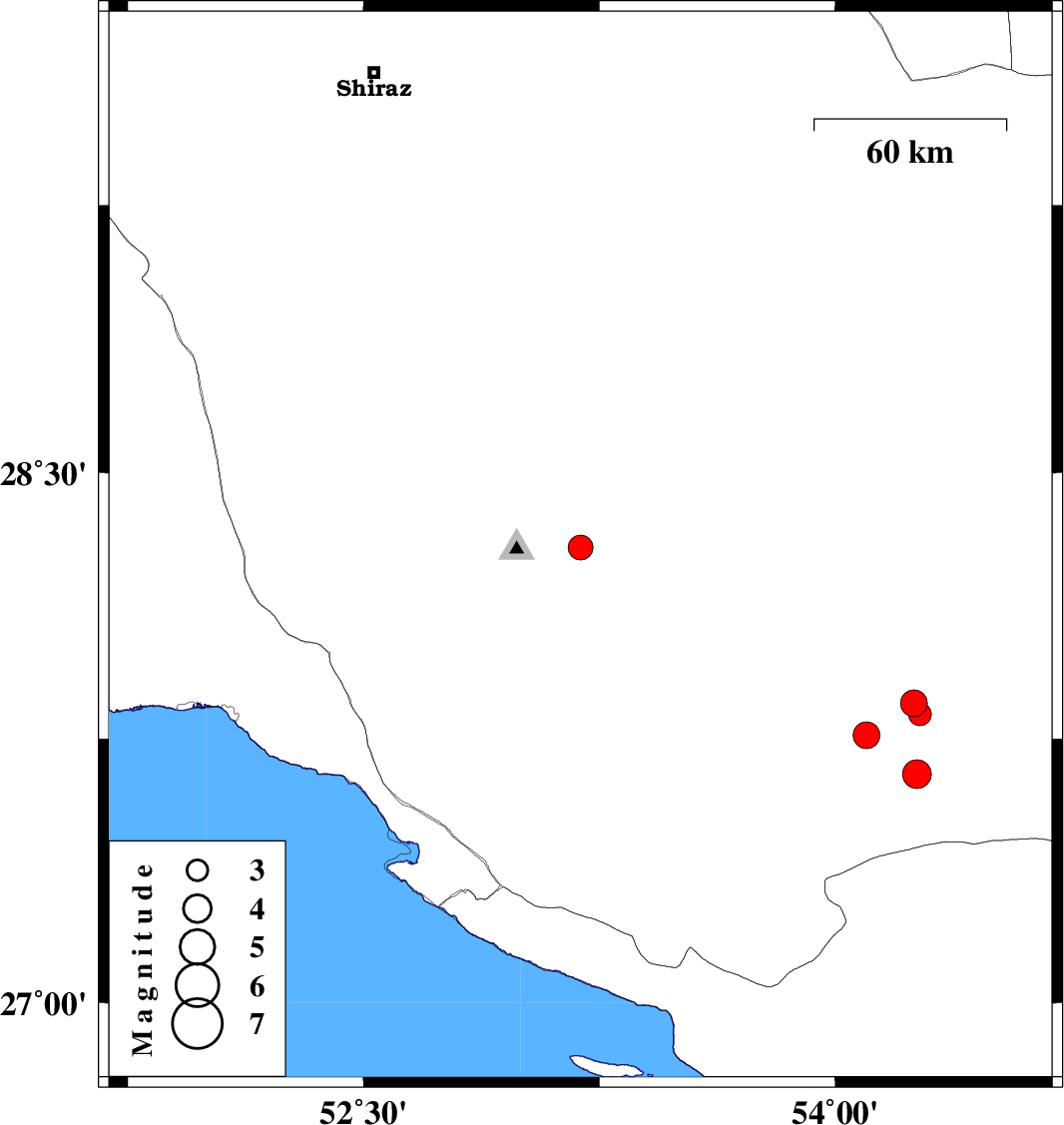 | 2014/11/06 | 01:14:26.6 | 04:44:26.6 | 27.76 | 54.1 | 14 | ML3.8 | Fars Province, 25 km West of Lar |