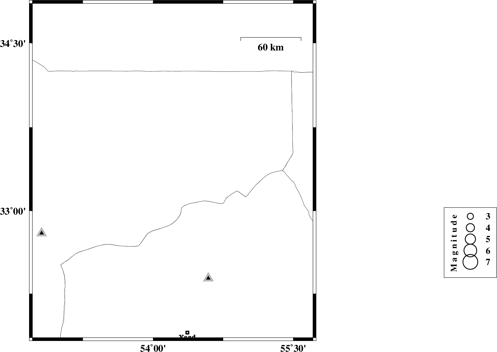 | 2014/11/28 | 02:19:29.7 | 05:49:29.7 | 33.35 | 54.21 | 43 | ML2.2 | Esfahan Province, 117 km North-East of Ardakan | ||