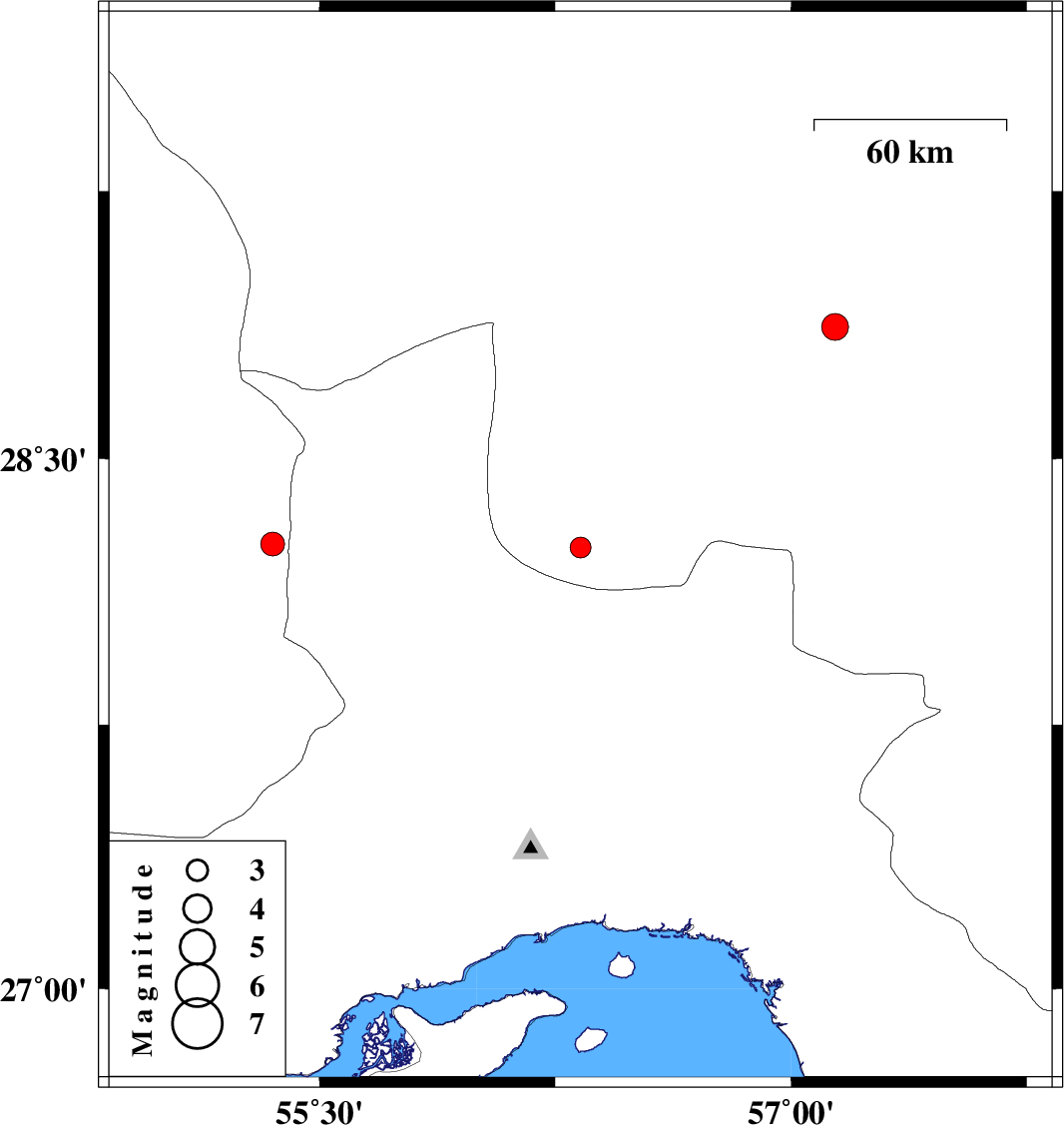| 2014/11/29 | 03:42:11.1 | 07:12:11.1 | 28.25 | 56.33 | 14 | ML3 | Kerman Province, 42 km East of Hajiabad | ||