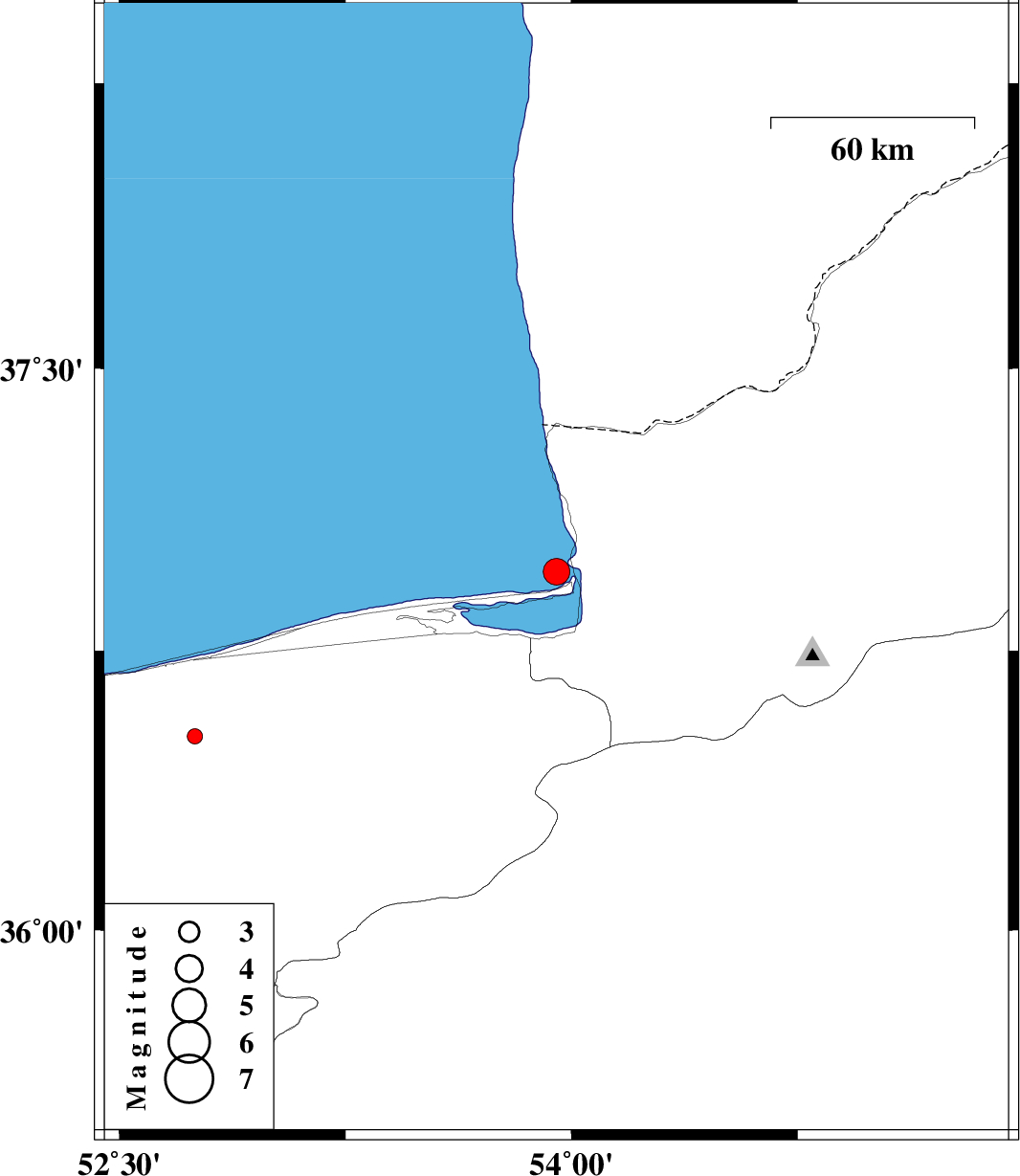 | 2014/12/05 | 02:49:29.8 | 06:19:29.8 | 36.96 | 53.95 | 15 | ML4 | Caspian Sea, 13 km West of Bandar-e torkaman |