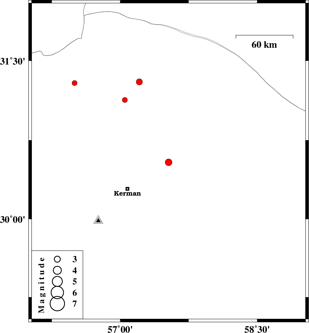 | 2014/12/12 | 04:10:43.8 | 07:40:43.8 | 30.54 | 57.53 | 14 | ML3.4 | Kerman Province, 51 km North-East of Kerman | ||