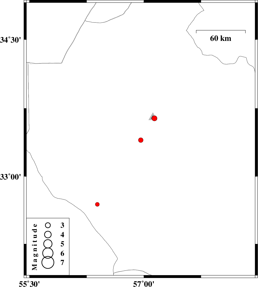 | 2014/12/13 | 05:17:56.5 | 08:47:56.5 | 33.64 | 57.14 | 12 | ML3.1 | Yazd Province, 20 km East of Tabas | ||