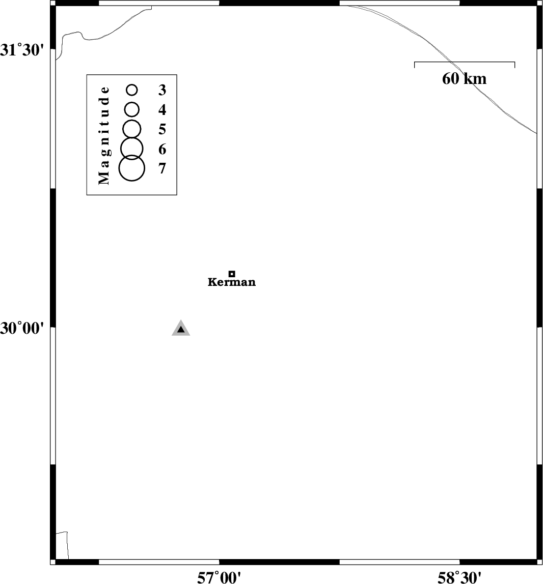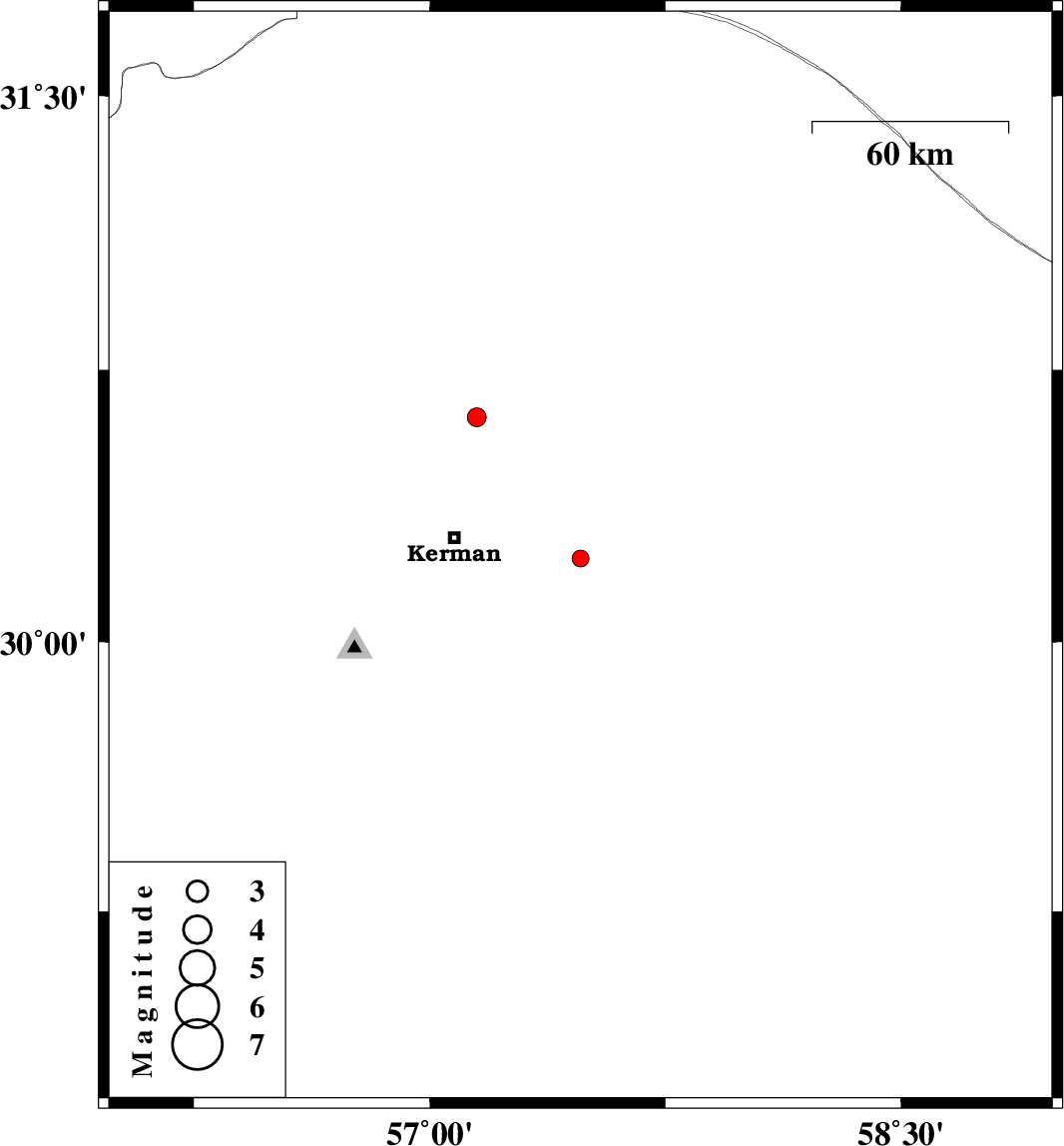 | 2014/12/28 | 10:15:25.6 | 13:45:25.6 | 30.62 | 57.15 | 18 | ML2.7 | Kerman Province, 38 km North of Kerman |
