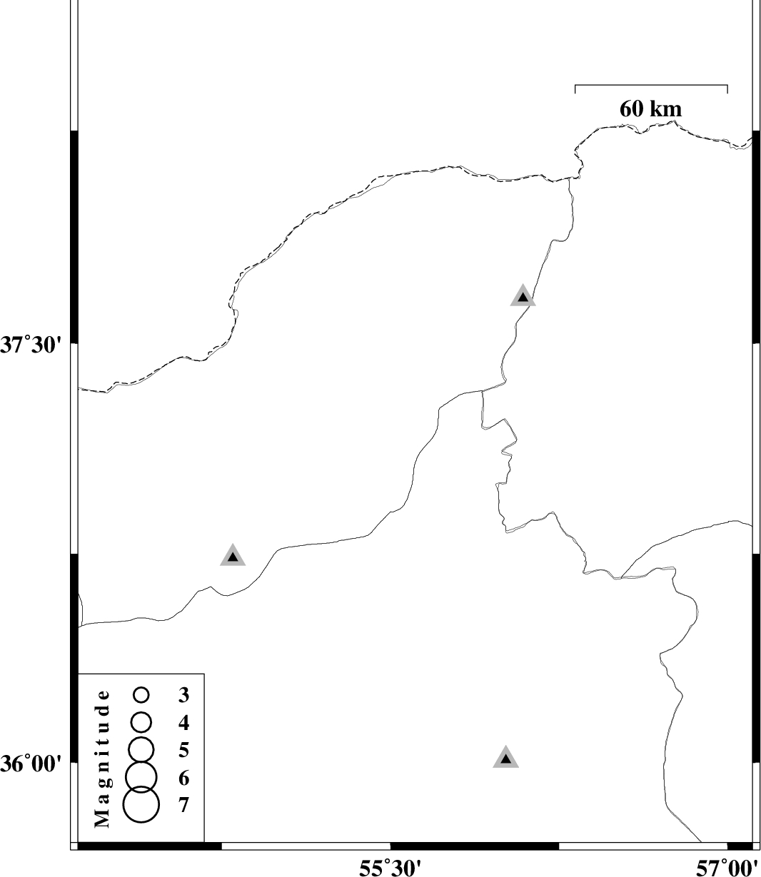 | 2014/12/30 | 07:29:54.5 | 10:59:54.5 | 37.21 | 55.61 | 14 | ML3.8 | Golestan Province, 20 km East of Minodasht |