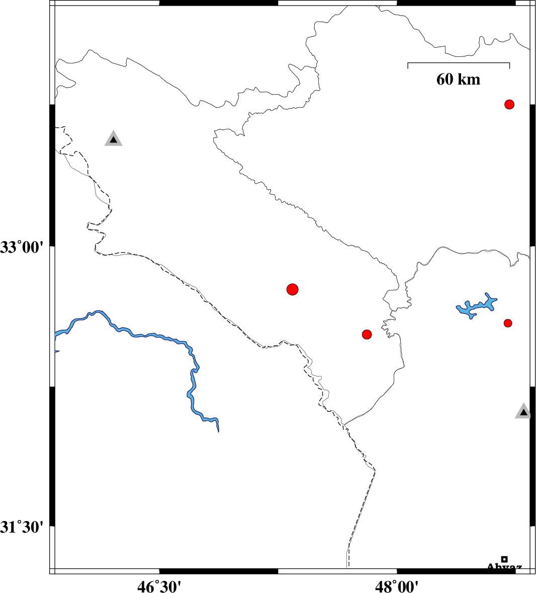 | 2014/12/31 | 08:03:16.2 | 11:33:16.2 | 32.77 | 47.34 | 14 | ML3.3 | Ilam Province, 11 km Dehloran | ||