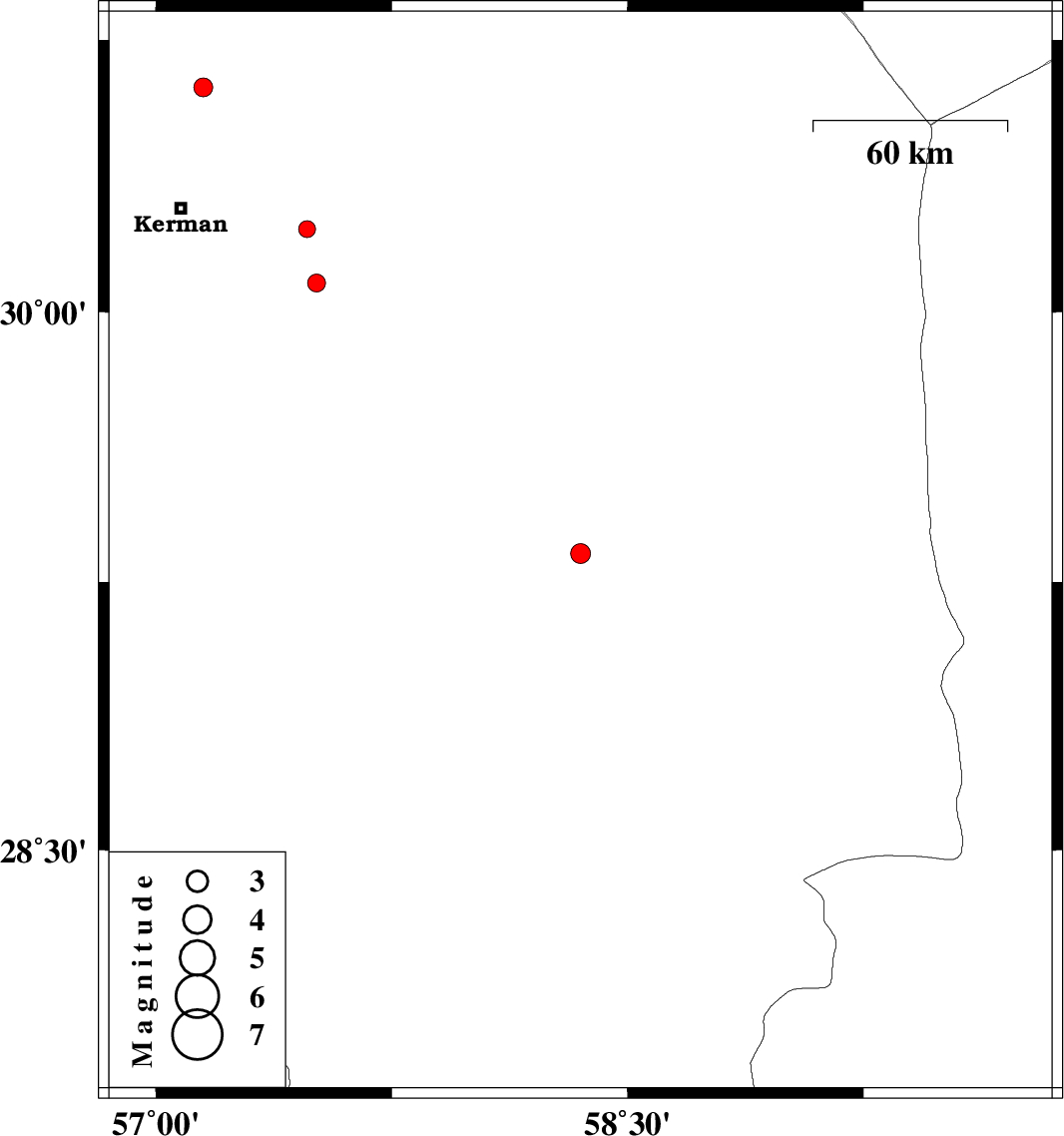 | 2014/12/28 | 10:15:25.6 | 13:45:25.6 | 30.62 | 57.15 | 18 | ML2.7 | Kerman Province, 38 km North of Kerman |