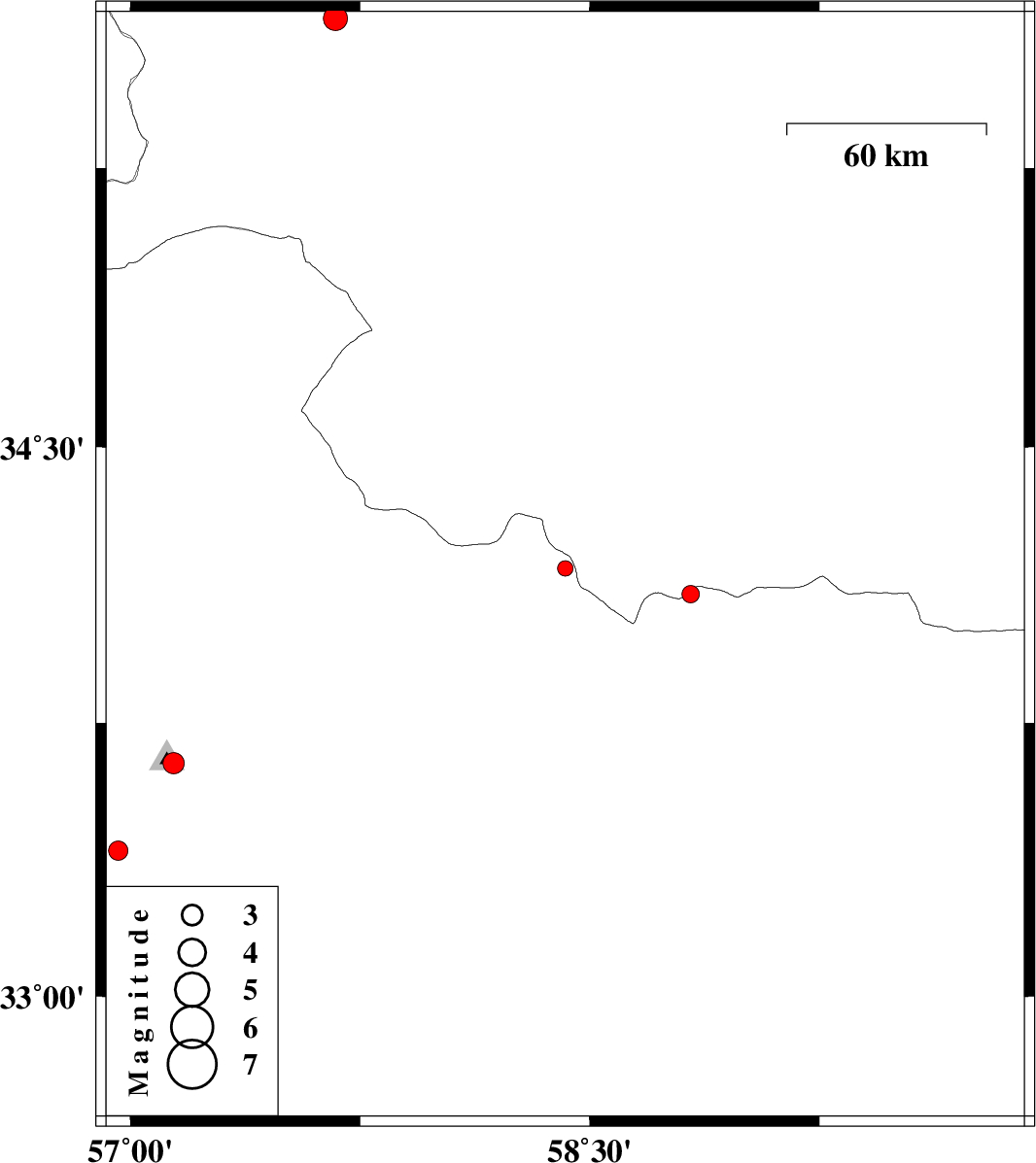 | 2014/12/05 | 00:32:53.9 | 04:02:53.9 | 34.1 | 58.83 | 15 | ML2.6 | 28 km South-East of Gonabad |
