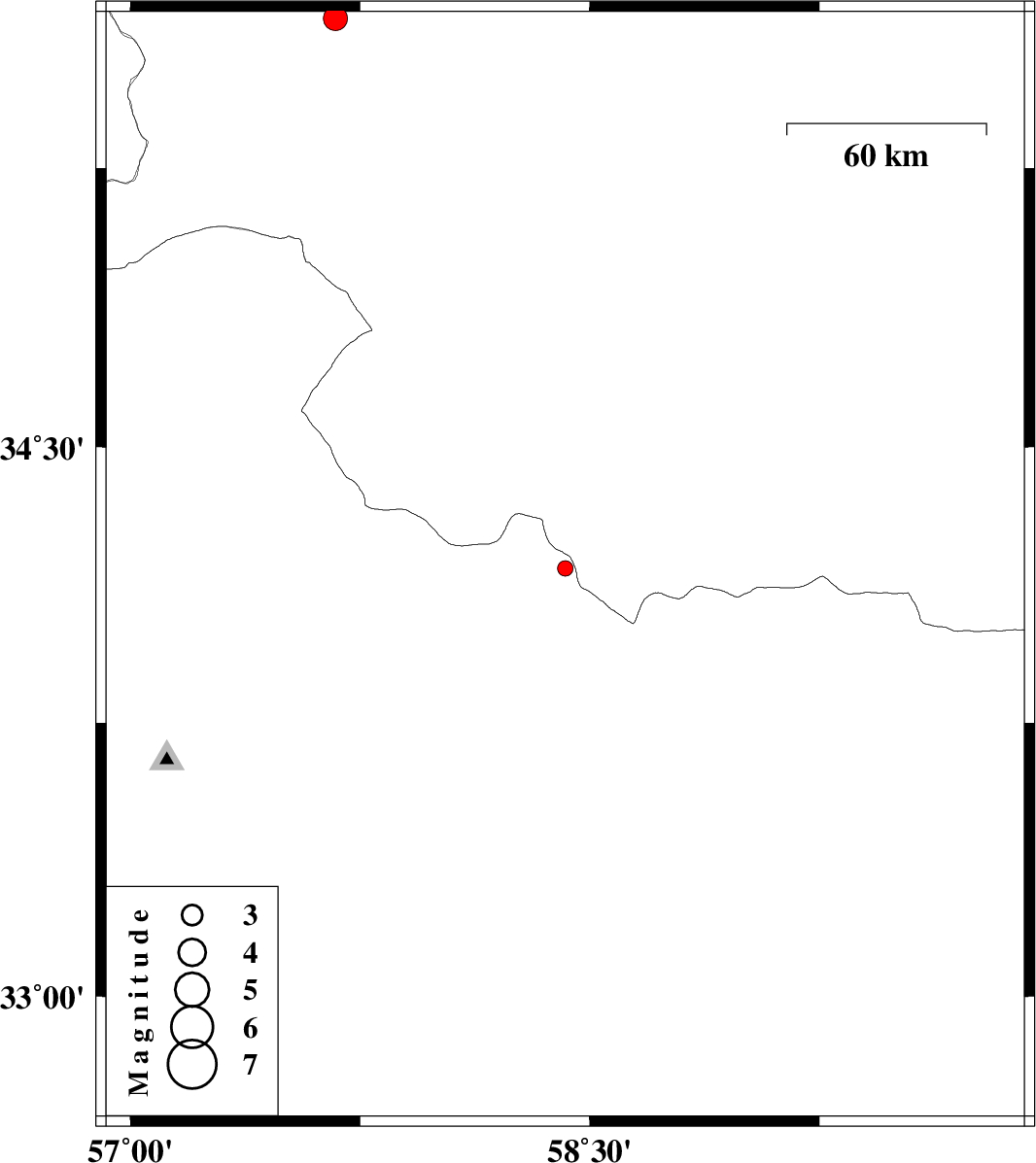 | 2015/01/01 | 22:01:26.3 | 01:31:26.3 | 34.17 | 58.42 | 14 | ML2.3 | Khorasan(center) Province, 28 km North-East of Ferdows | ||