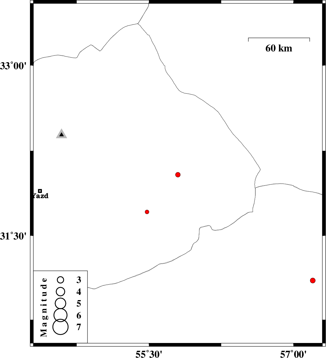 | 2015/01/04 | 10:54:03.6 | 14:24:03.6 | 31.71 | 55.48 | 14 | ML1.9 | Yazd Province, 14 km North of Bafq |