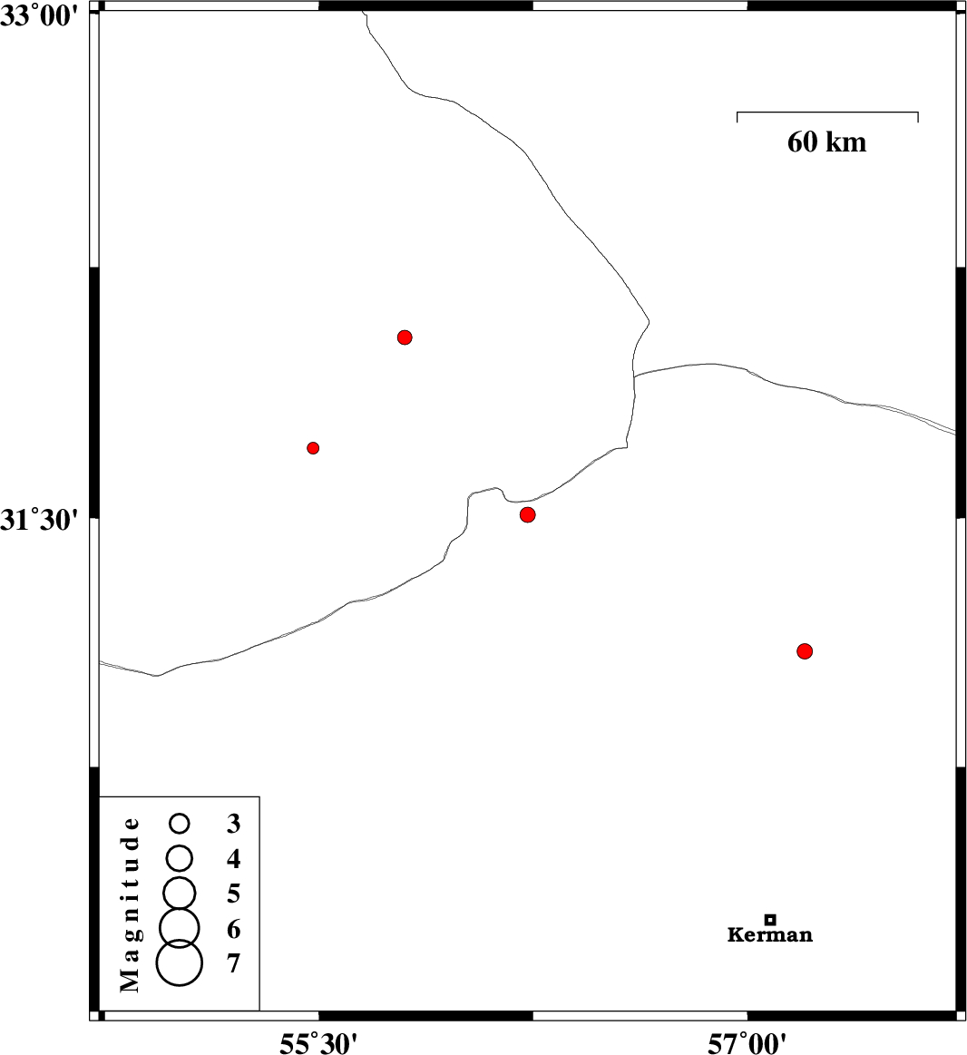 | 2015/01/04 | 10:54:03.6 | 14:24:03.6 | 31.71 | 55.48 | 14 | ML1.9 | Yazd Province, 14 km North of Bafq |