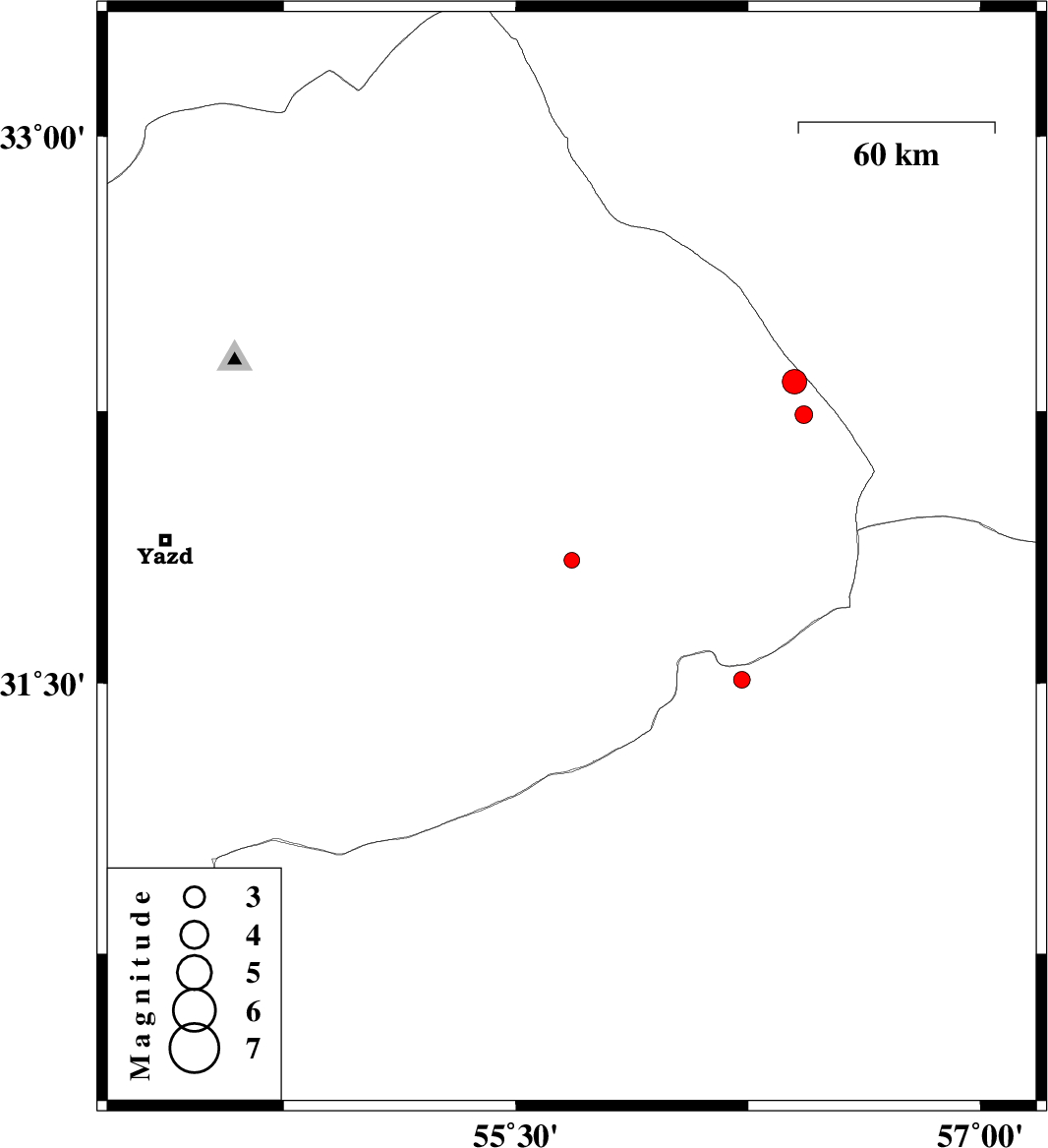 | 2015/01/13 | 03:20:25.1 | 06:50:25.1 | 32.33 | 56.4 | 15 | ML3.5 | Yazd Province, 124 km North-West of Ravar | ||
