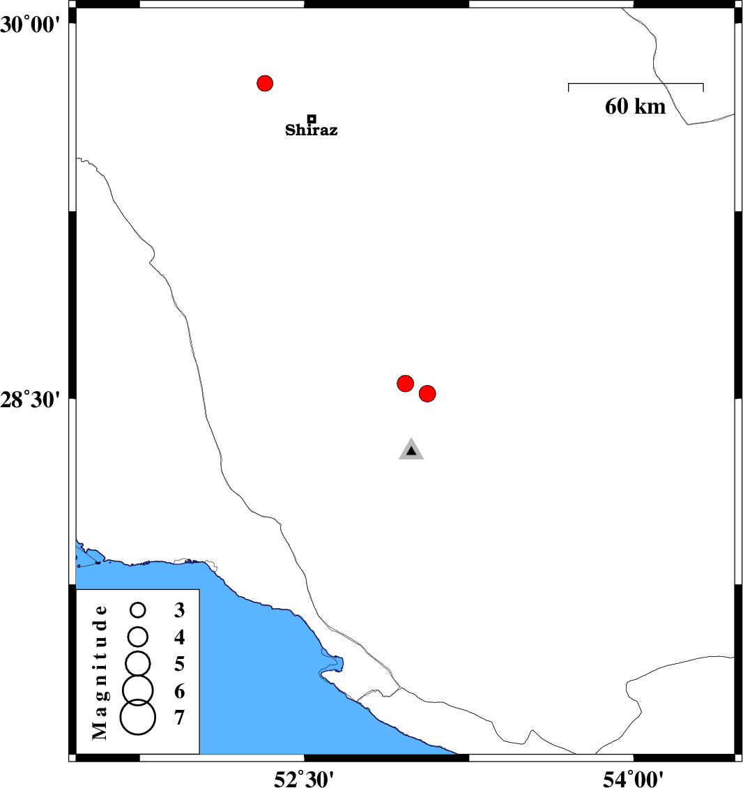 | 2015/01/22 | 10:30:56.2 | 14:00:56.2 | 28.52 | 53.06 | 14 | ML3.4 | Fars Province, 6 km Qir va Karzin | ||