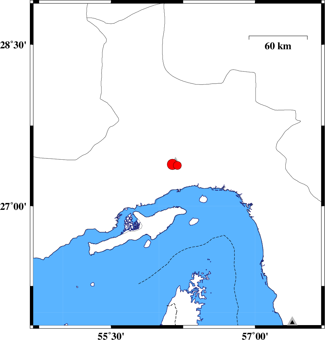 | 2015/01/25 | 20:11:19.3 | 23:41:19.3 | 27.39 | 56.14 | 14 | ML5 | Hormozgan Province, 27 km North-West of Bandar-e abbas |