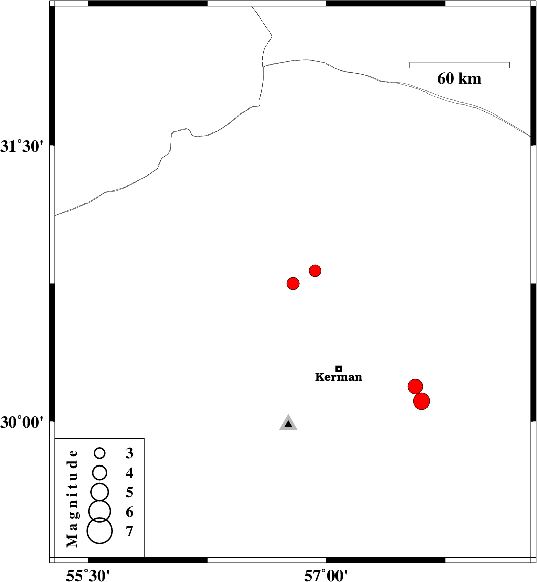 | 2015/02/17 | 13:41:37.4 | 17:11:37.4 | 30.11 | 57.6 | 14 | ML4.6 | Kerman Province, 53 km South-East of Kerman | ||