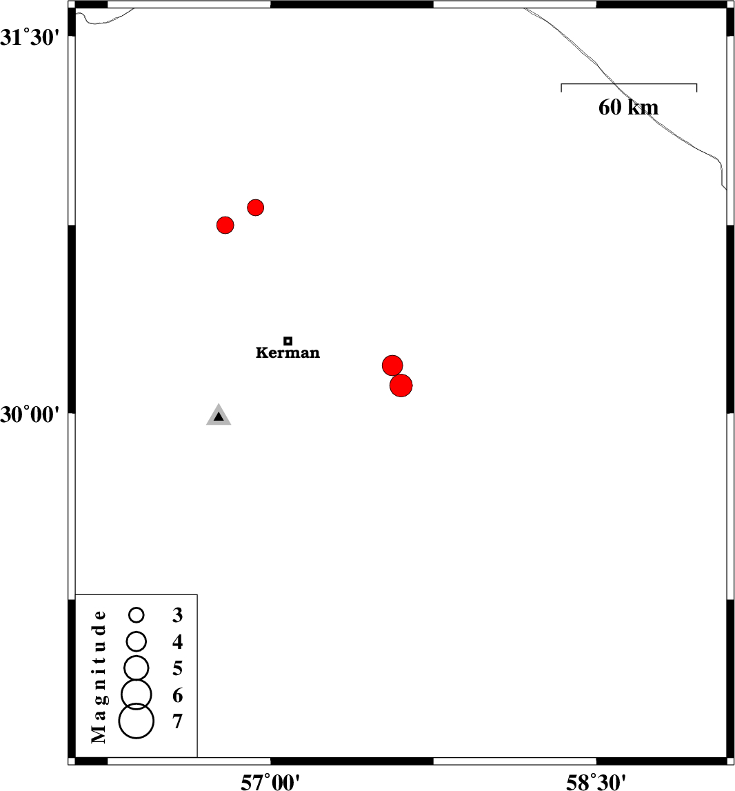 | 2015/02/17 | 13:41:37.4 | 17:11:37.4 | 30.11 | 57.6 | 14 | ML4.6 | Kerman Province, 53 km South-East of Kerman | ||