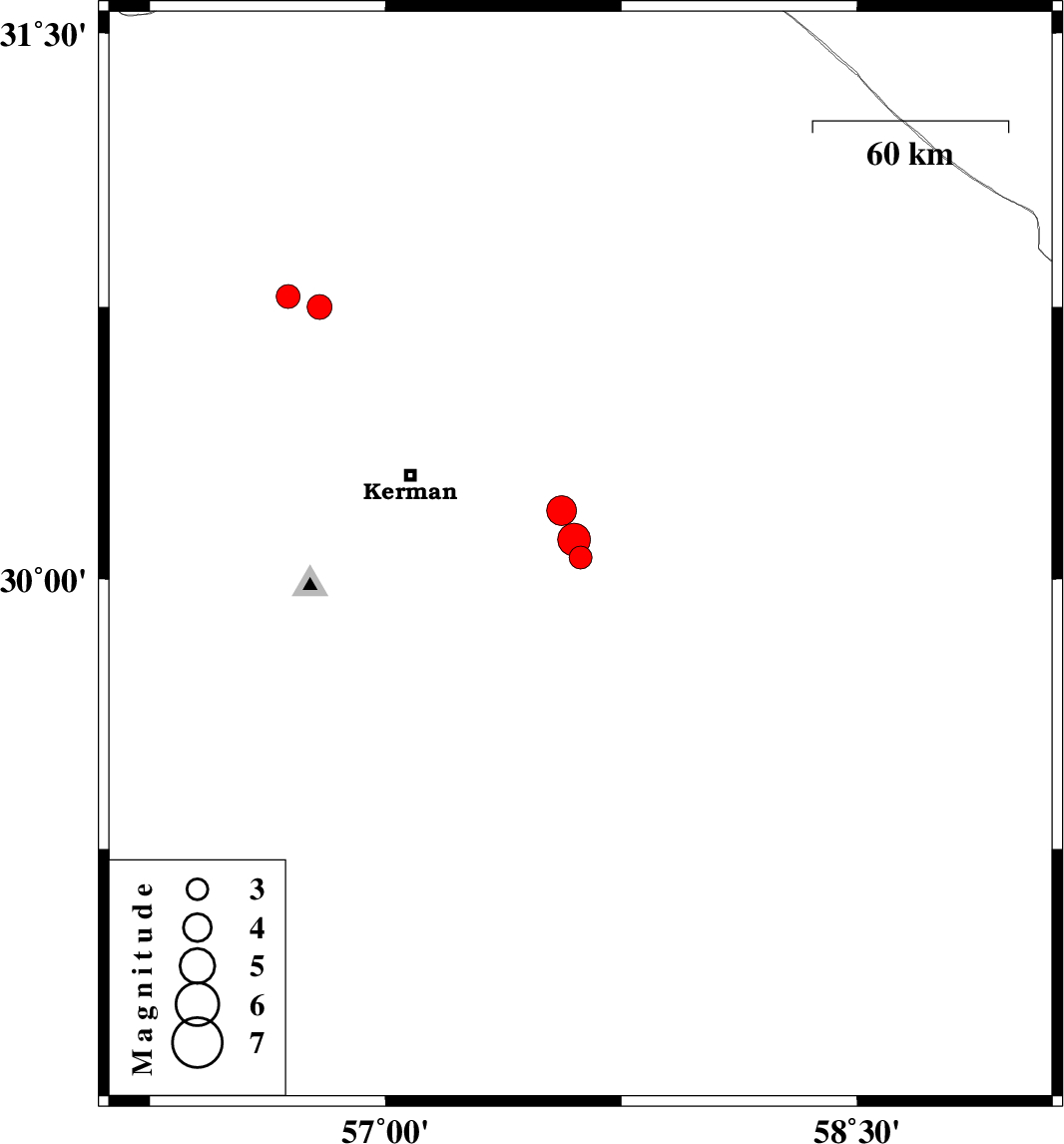 | 2015/02/17 | 13:41:37.4 | 17:11:37.4 | 30.11 | 57.6 | 14 | ML4.6 | Kerman Province, 53 km South-East of Kerman | ||