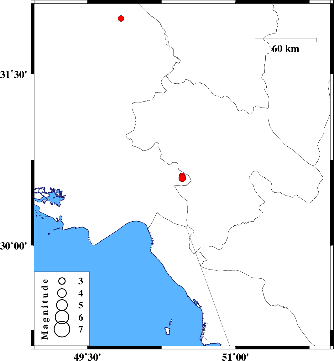 | 2015/02/24 | 10:57:03.2 | 14:27:03.2 | 30.59 | 50.46 | 14 | ML3.2 | Khoozestan Province, 20 km East of Behbahan | ||