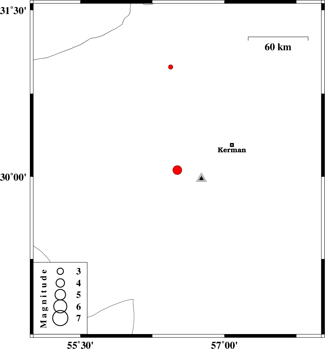 | 2015/03/03 | 10:07:59.0 | 13:37:59.0 | 30.99 | 56.44 | 14 | ML2.1 | Kerman Province, 23 km North-West of Zarand |