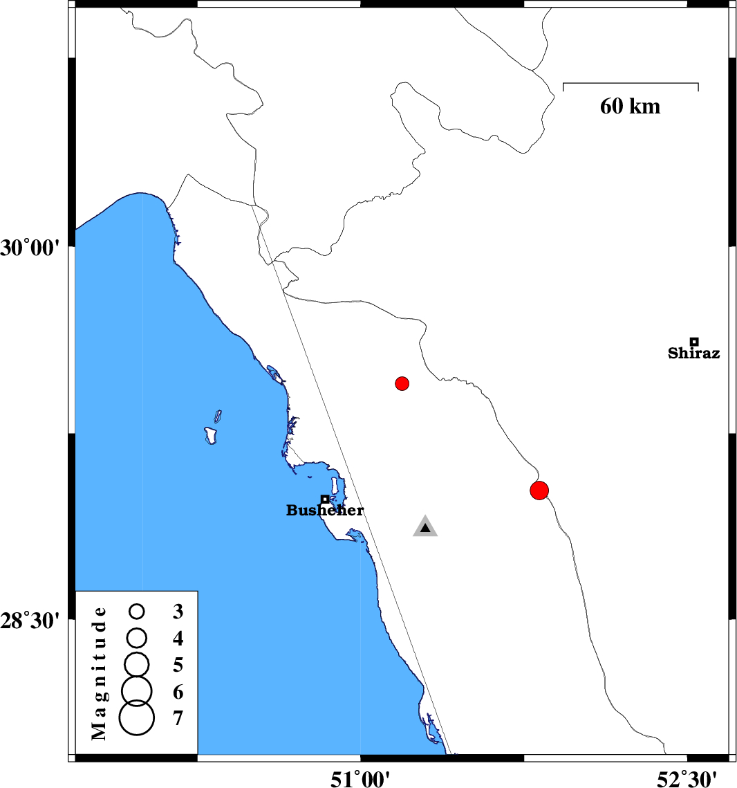 | 2015/03/09 | 23:19:24.9 | 02:49:24.9 | 29.45 | 51.19 | 14 | ML2.8 | Bushehr Province, 21 km North of Borazjan | ||