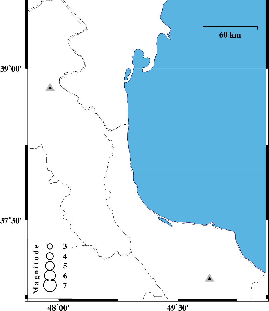 | 2015/03/12 | 00:42:35.5 | 04:12:35.5 | 38.21 | 49.11 | 14 | ML4.7 | Caspian Sea, 32 km South-East of Astara |