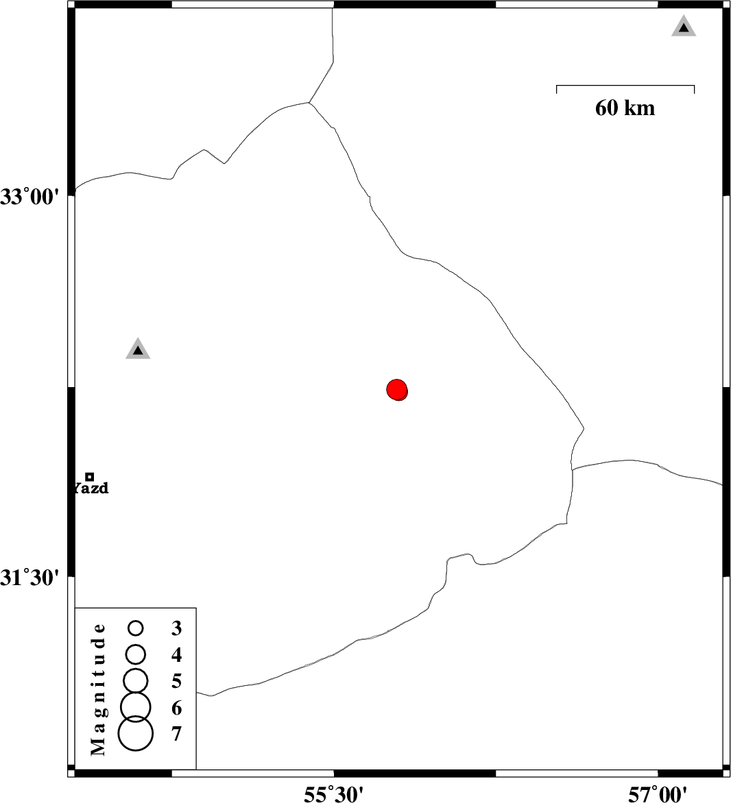 | 2015/03/30 | 06:45:25.1 | 11:15:25.1 | 32.23 | 55.8 | 14 | ML3.6 | Yazd Province, 80 km North-East of Bafq |
